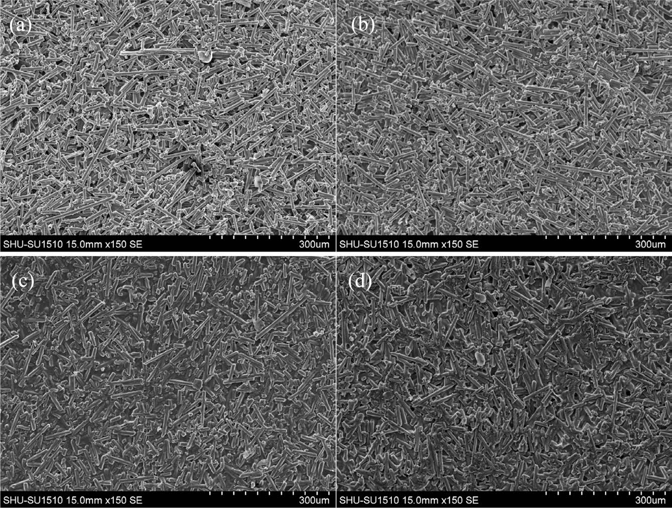 Scanning electron microscopy images for the internal conductive networks of (a) T2 sample; (b) T4 sample; (c) T6 sample; (d) T8 sample.