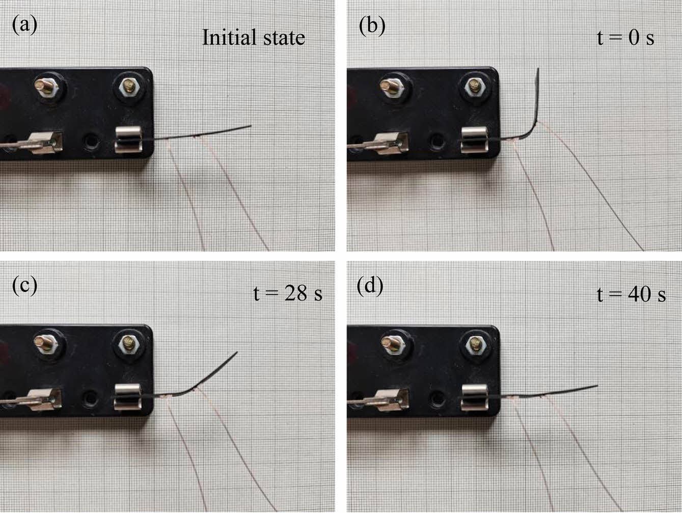Shape memory progress of T4 sample: (a) initial state; (b) t = 0 s; (c) t = 28 s; (d) t = 40 s.
