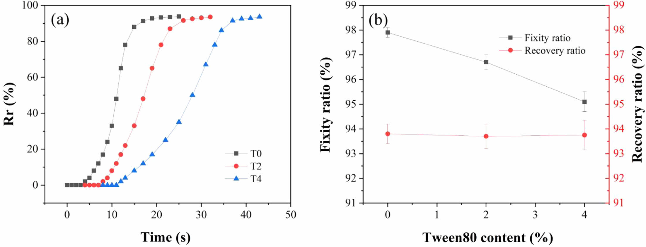 As shown in Figure 8(a), the shape recovery ratio versus time curve of T0, T2 and T4 samples under 9 V voltage. It could be seen that the T0 sample only took 20 s from the temporary shape to the original shape, while the T4 sample took 40 s. Due to the electrical conductivity of T4 sample was the lowest, it took more time to reach Tg at the same voltage. With the increased of Tween80 content, it took more time to complete the shape memory recovery process. At the same time, PVA/SCFs/Tween80 composite maintained a high shape recovery ratio.
