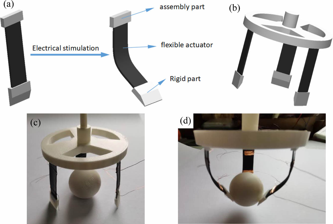 Structural design diagram and physical demonstration diagram of soft gripper: (a) electrical stimulation deformation of single self-folding structure; (b) schematic diagram of soft grabber; (c) the initial state of the soft gripper; (d) soft gripper in operation.