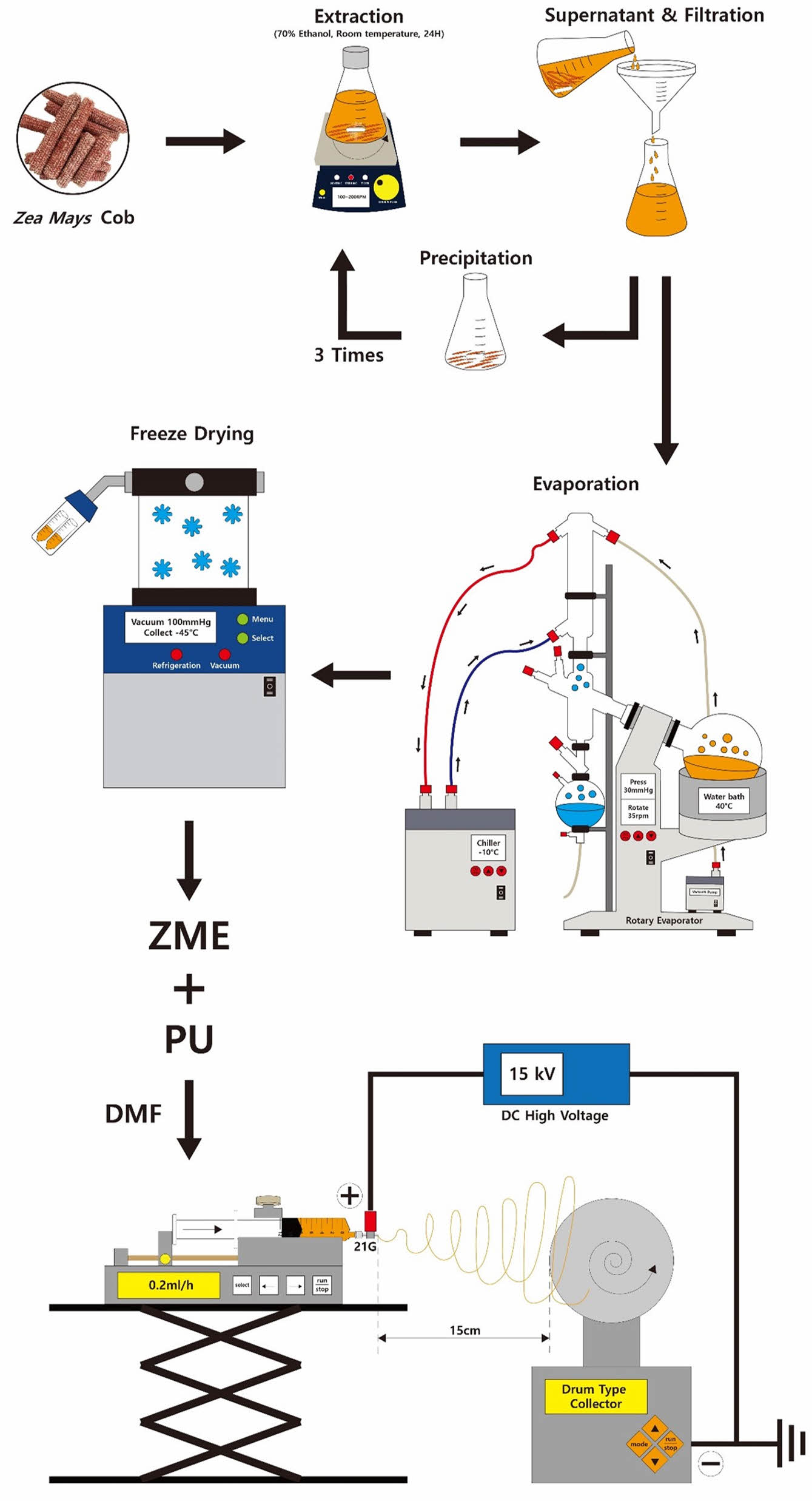 Figure 1 Extraction of ZME and fabrication of ZME/PU nanofiber web. |