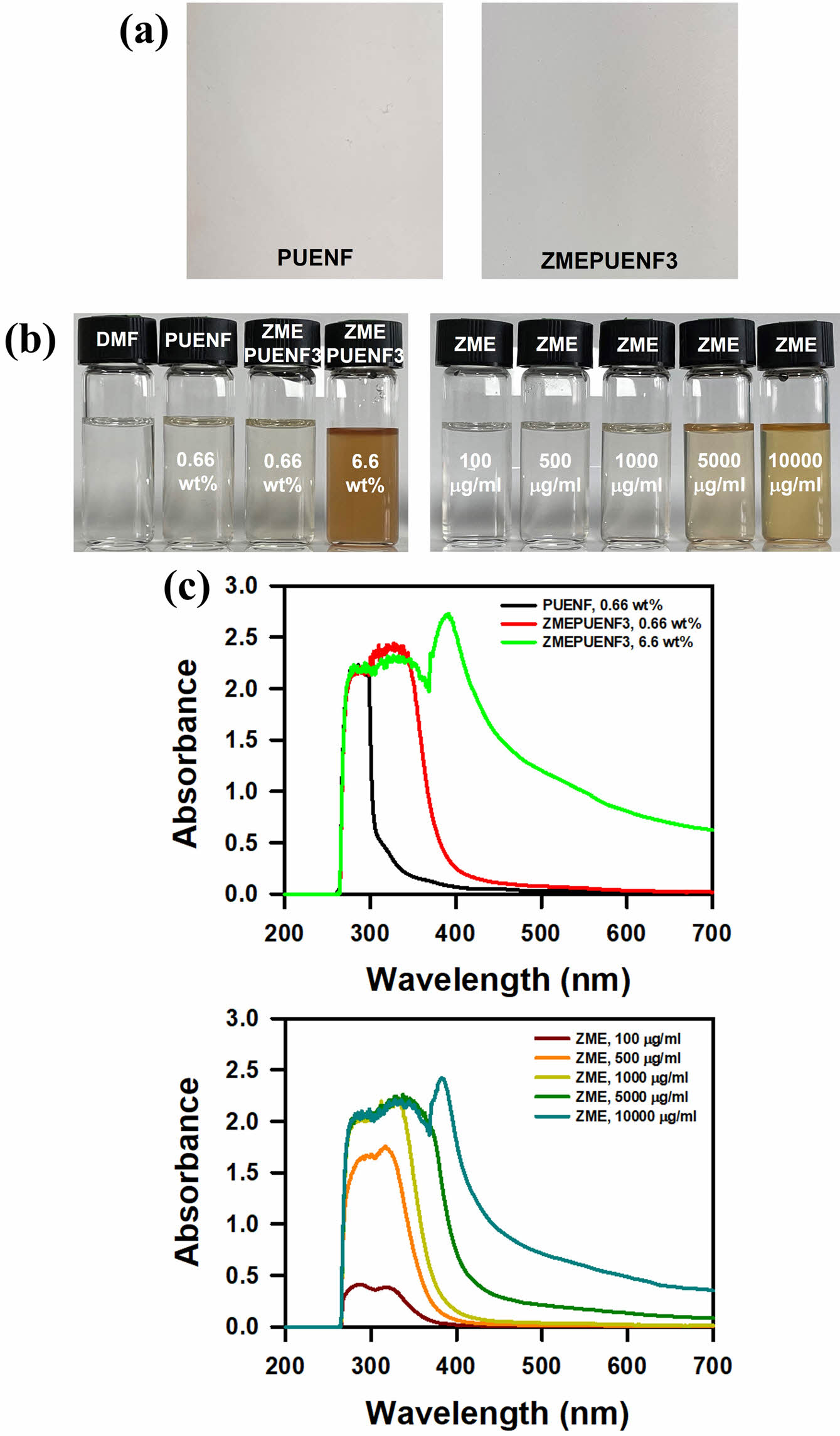 Figure 3 (a) Photographs of PUENF and ZMEPUENF3; (b) photographs of ZME and ZMEPUENF3 solution in DMF; (c) UV/Vis absorption spectra of ZMEPUENF3 and ZME. |