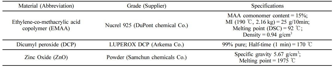 재료. 본 연구에 적용된 EMAA는 methacrylic acid(MAA) 함량 15 wt%인 Nucrel 925(DuPont chemical Co., USA)를 사용하였다. 가교제는 zinc oxide(Samchun chemicals Co., Korea)와 dicumyl peroxide(LUPEROX DCP, Arkema Co., Ltd., USA)를 사용하였다. 본 연구에 사용된 재료의 주요 특성을 Table 1에 나타내었다. EMAA는 50 ℃에서 24시간 건조하여 사용하였고, 가교제인 DCP와 ZnO는 별도 처리 없이 구입하여 받은 그대로 실험에 사용하였다.