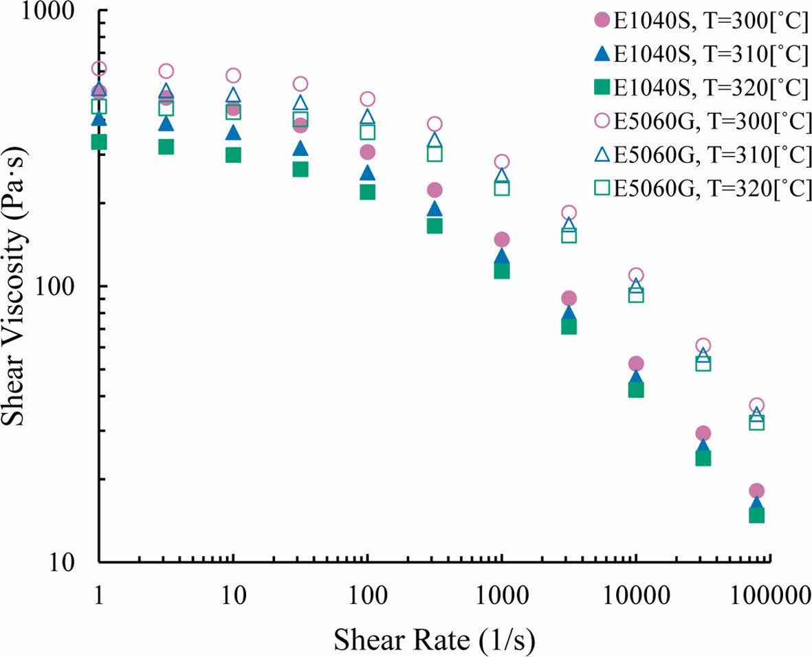 Figure 1에 두 수지의 전단점도 곡선(shear viscosity curve)이 나타나 있다. E5060G가 E1040S에 비해 높은 전단점도를 보이며 뉴튼점도(Newtonian viscosity)영역이 크다. E1040S는 점도가 작음에도 큰 전단박하(shear thinning) 현상을 보이고 있어 전단변형률(shear rate)이 높은 사출성형에서 성형성이 더 좋을 것으로 예측된다.