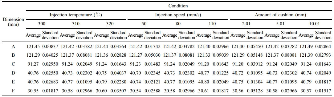 E1040S 수지의 수축. E1040S 수지를 이용한 사출성형 후 Figure 2에 표시된 시편의 치수가 Table 1에 나타나 있다. 사출온도는 300, 310, 320 ℃, 사출속도 50, 80, 110 mm/s 그리고 큐션량 2, 5, 10 mm에 따른 치수 A, B, C, D, E, F의 평균 치수 및 표준편차가 나타나 있다. 각 성형조건에서 다섯 번 실험을 하여 평균값 및 표준편차를 계산하였다. 표준편차가 매우 작아서 실험의 일관성이 있음을 알 수 있다.