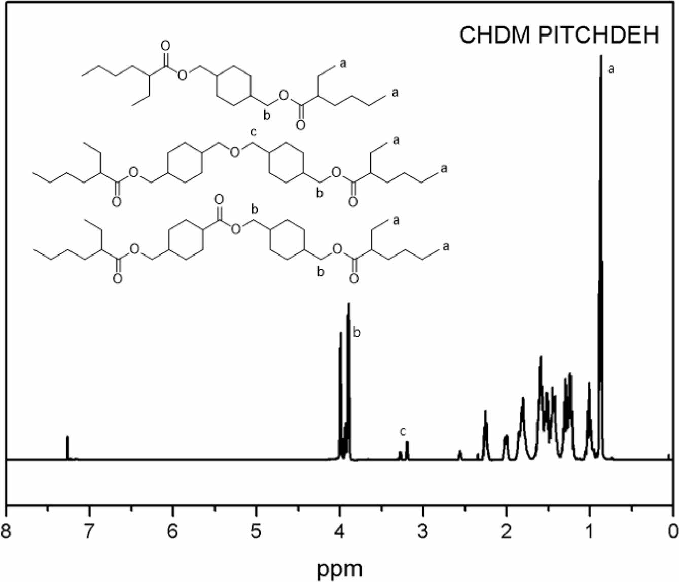 1,4-Cyclohexanedimethanol Pitch Bis(2-ethylhexanoate) (CHDM PITCHDEH, Figure 2): Yield 91%, viscous oil, 1H NMR(500 MHz, CDCl3), δ(ppm), 0.86-1.01(m, 18H, -CH3), 1.20-1.35(m, 12H, -CH2-), 1.38-1.41(m, 6H, -CH2-), 1,44-1.51 (m, 12H, -CH2-), 1.55-1.66(m, 6H, -CH-) 1.73-1.82 (m, 2H, -CH-), 1.98-2.03(m, 2H, -CH-), 2.25(m, 2H, -CH-), 3.18-3.29 (m, 2H, -CH-), 3.91(m, 2H, -CH-), 4.00(m, 6H, -CH-).