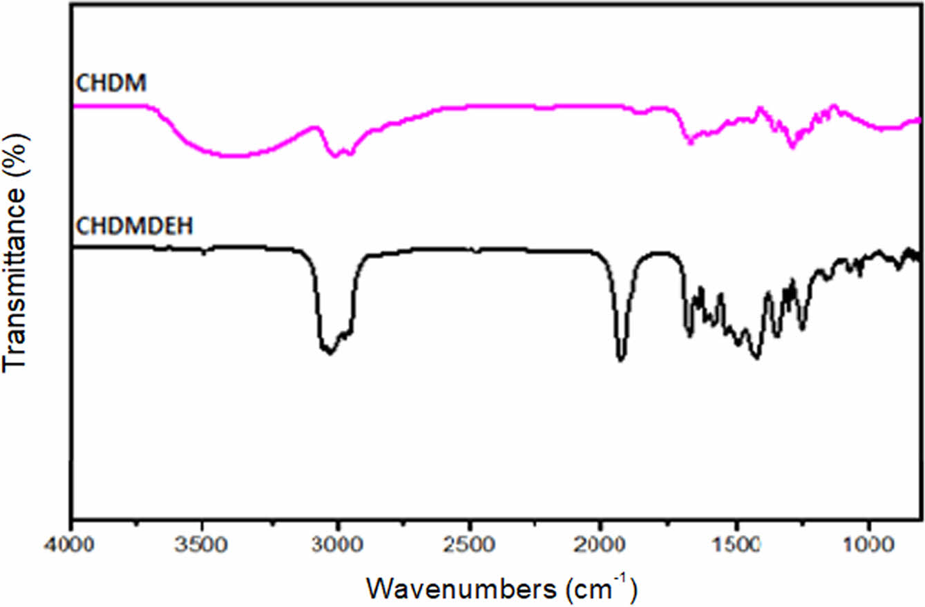 Figure 3 The FTIR spectra of cyclohexanedimethanol and CHDMDEH plasticizer. |