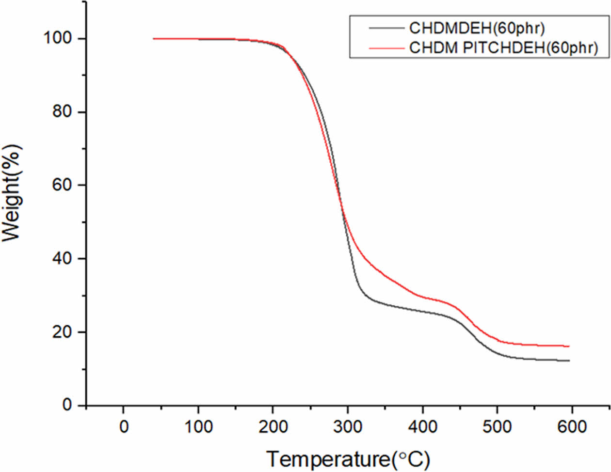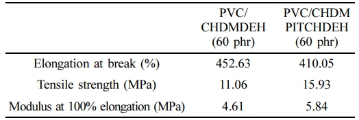 p-PVC 시편의 기계적 특성 평가.Shore A durometer를 사용하여 p-PVC의 가소화 특성을 분석하였다. Table 3에 동일 함량(60 phr)의 가소제가 배합된 p-PVC의 Shore A hardness에 대한 측정값을 나타내었다. CHDMDEH보다 CHDMPITCHDEH가 약간 더 높은 경도값을 보여주었으며, 이는 CHDMPITCHDEH가 탄소수가 많은 이합체(dimer) 구조를 ~90% 정도 가지고 있어 CHDMDEH보다 가소화 효율을 약간 감소시킨 것으로 관찰되었다. Table 4에는 p-PVC 샘플의 UTM 측정값을 나타내었다. 연신율은 CHDMPITCH DEH가 CHDMDEH 적용 시보다 낮게 측정되었고 인장강도와 탄성률은 증가하는 경향을 보여주었다. UTM 측정 결과, Shore A 경도 측정 결과와 마찬가지로 CHDMDEH가 CHDMPITCH DEH 보다 더 높은 가소화 효율을 보여주었다. 이러한 경향은 가소제의 분자량이 증가하면 가소화 효율이 낮아져서 경도, 그리고 인장강도 등이 증가한 것으로 보인다.