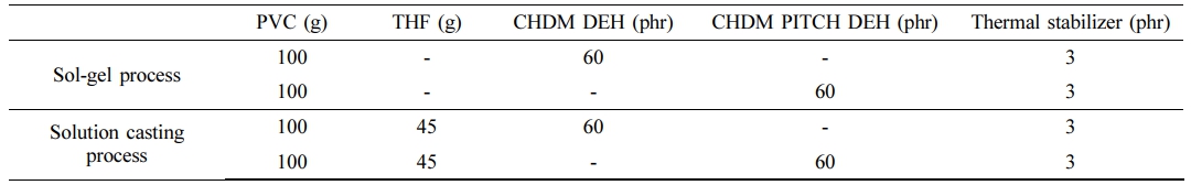 1,4-Cyclohexanedimethanol Bis(2-ethylhexanoate) 및 1,4-Cyclohexanedimethanol Pitch Bis(2-ethylhexanoate) 함유 PVC(이하 p-PVC) 시편 제작. 신규 가소제를 PVC 수지에 적용하여 PVC 시편(p-PVC)을 제작하였다. 신규 가소제의 기계적 특성 평가를 위해 졸-겔(sol-gel) 공정방법으로 coin 형태 및 dog-bone 형태 시편을 제작하였고 PVC로부터 가소제의 이행 특성 및 열적 특성 평가를 수행하기 위해 THF를 용매로 사용하여 solution casting 방법으로 필름 형태의 PVC 시편을 제작하였다. Table 2에 p-PVC 제작 배합 비율을 나타내었다.