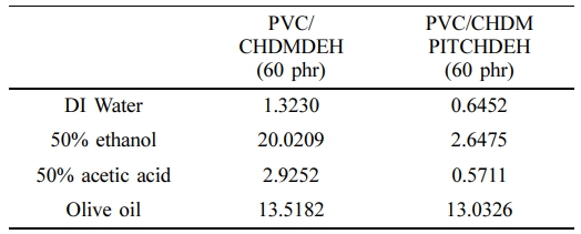p-PVC 시편의 가소제 이행성 평가. 합성한 2종의 가소제가 적용된 필름형 p-PVC를 사용하여 용매 및 열에 의한 이행 특성을 분석하였다. Table 5 및 6에 p-PVC로부터 가소제의 용매에 대한 이행 정도에 대한 측정값, 그리고 p-PVC로부터 가소제의 열에 의한 이행성 측정값을 나타내었다. 다양한 용매에 의한 p-PVC에서의 가소제의 내이행성은 CHDMPITCHDEH가 CHDMDEH보다 더 좋은 특성을 보였으며, 열에 의한 p-PVC에서의 가소제의 내이행성도 용매에 의한 이행 특성 분석 결과와 동일하게 CHDM PITCHDEH가 CHDMDEH보다 더 좋은 특성을 보여주었다.