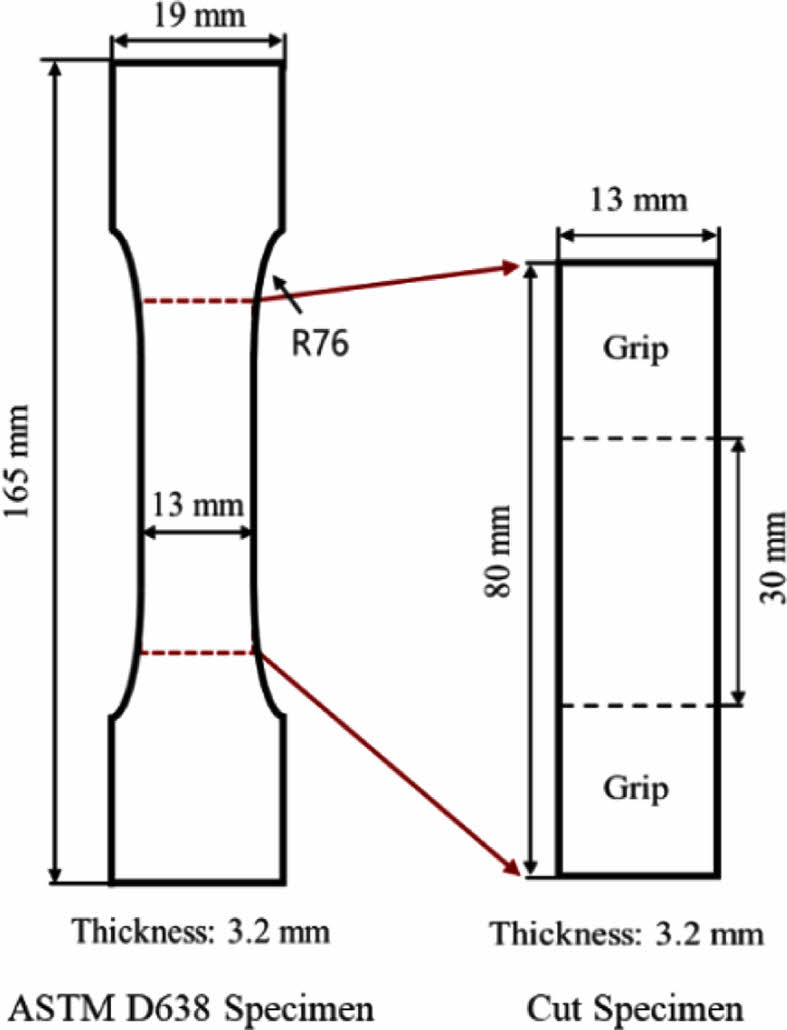 인장시편. PC, PMMA의 인장시험을 위한 ASTM D638 인장 시편(벌크 시편)이 Figure 2에 나타나 있다. PC, PMMA 벌크 시편은 사출성형으로 제작하였다. 고온 측정 시 활용되는 챔버의 길이 제한이 있어 측정 시편의 통일성을 위해 상온, 고온 모두 Figure 2에 나타난 바와 같이 시편을 절단하여 사용하였다. 잘라낸 시편의 게이지 길이는 30 mm로 하여 인장시험을 수행하였다. PC/PMMA 다층 필름의 시편이 Figure 3(ASTM D882)에 나타나 있다.