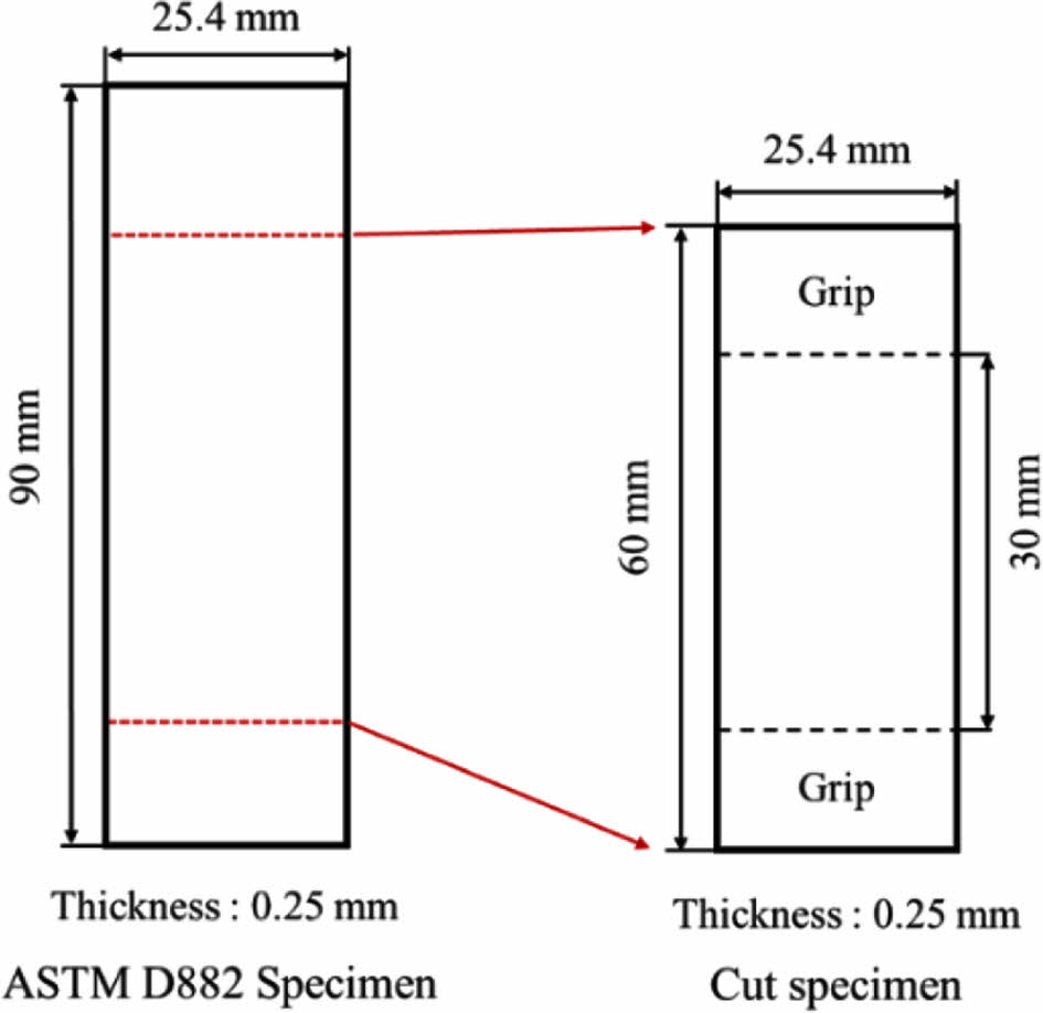 고온에서 필름의 물성 측정 시 챔버의 길이 제한으로 인해 ASTM D882시편에서 길이를 짧게 제작하였다. 시편의 게이지 길이를 30 mm으로 적용하여 인장시험을 수행하였다.