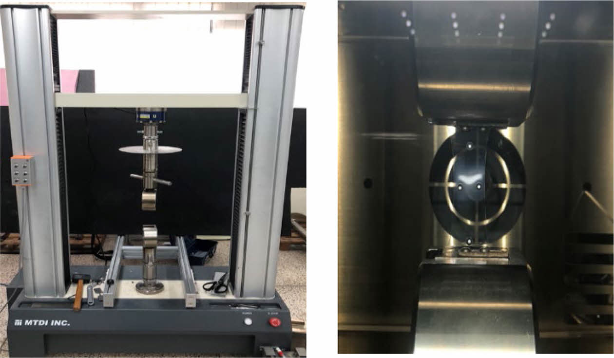 Figure 4 Tensile test apparatus and isothermal chamber. Tensile testing apparatus (left) and isothermal chamber having transparent glass window (right). |