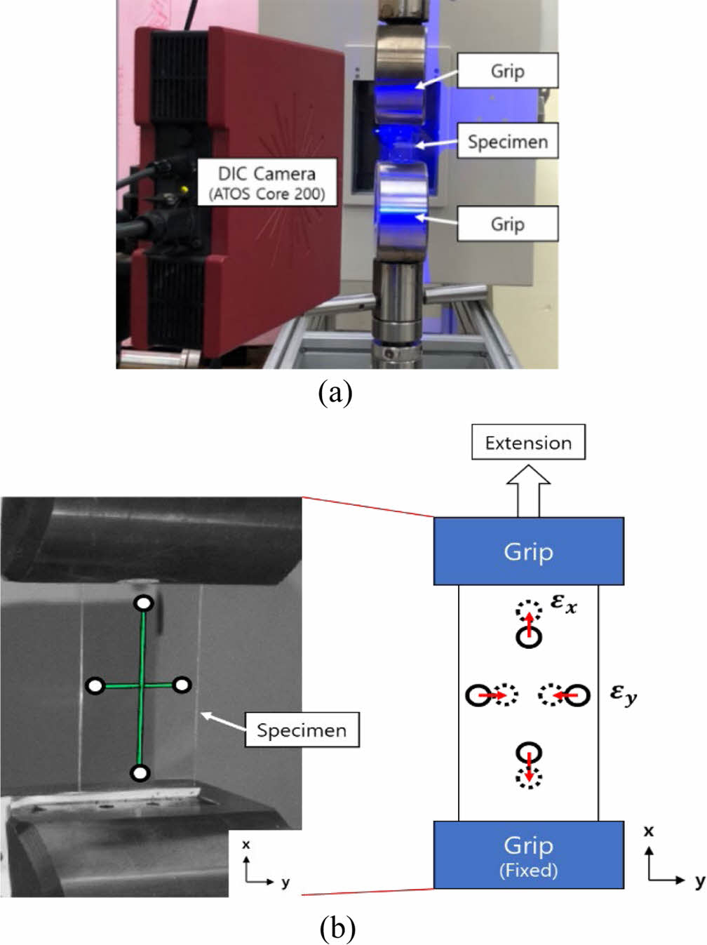 Figure 5 Digital image correlation (DIC) equipment for the measurement of Poisson’s ratio by digital camera: (a) Apparatus for Poisson’s ratio measurement; (b) Schematic drawings for the measurement Poisson’s ratio. |