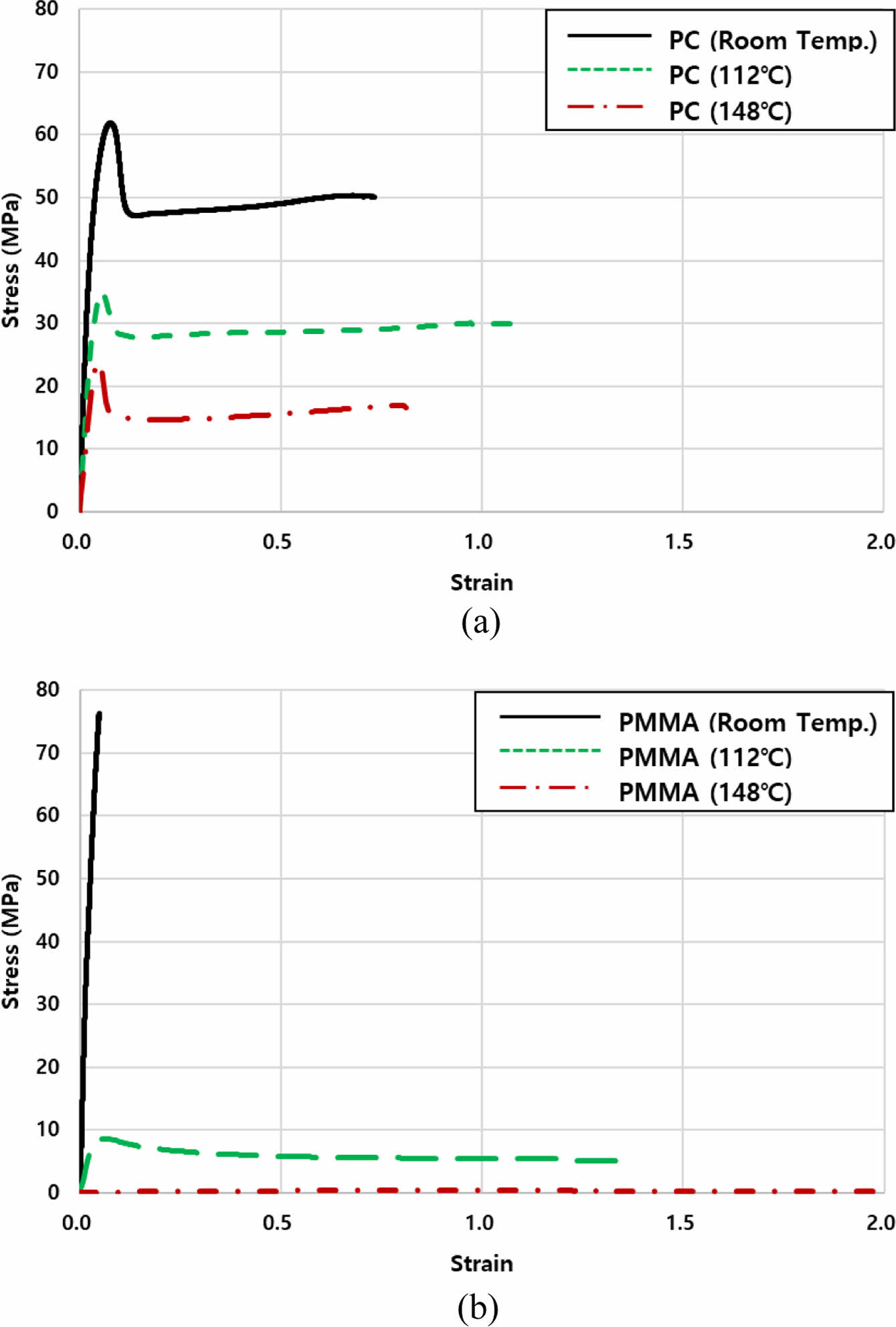 PMMA는 상온에서 취성의 성질을 보였지만 온도 상승 시, 파단 연신율이 크게 증가하며 온도에 따른 큰 물성의 변화를 보였다. PMMA는 상온에서 항복강도, 인장강도, 그리고 탄성계수는 PC보다 컸지만 112 ℃ 및 148 ℃에서는 PC보다 현저히 낮게 나타났다. 프와송 비는 상온에서는 0.371로 PC보다 작았으나 온도 상승 시 0.441로 PC보다 크게 증가하는 경향을 보였다. 상온을 기준으로 프와송 비가 112 ℃, 148 ℃에서 각각 14.3, 15.8% 증가하며 PC에 비해 급격히 증가하였다. 이는 온도 상승에 따라 소재의 강도와 강성이 감소하며 고무와 같은 특성을 보이며 프와송 비도 증가한 것으로 판단된다.