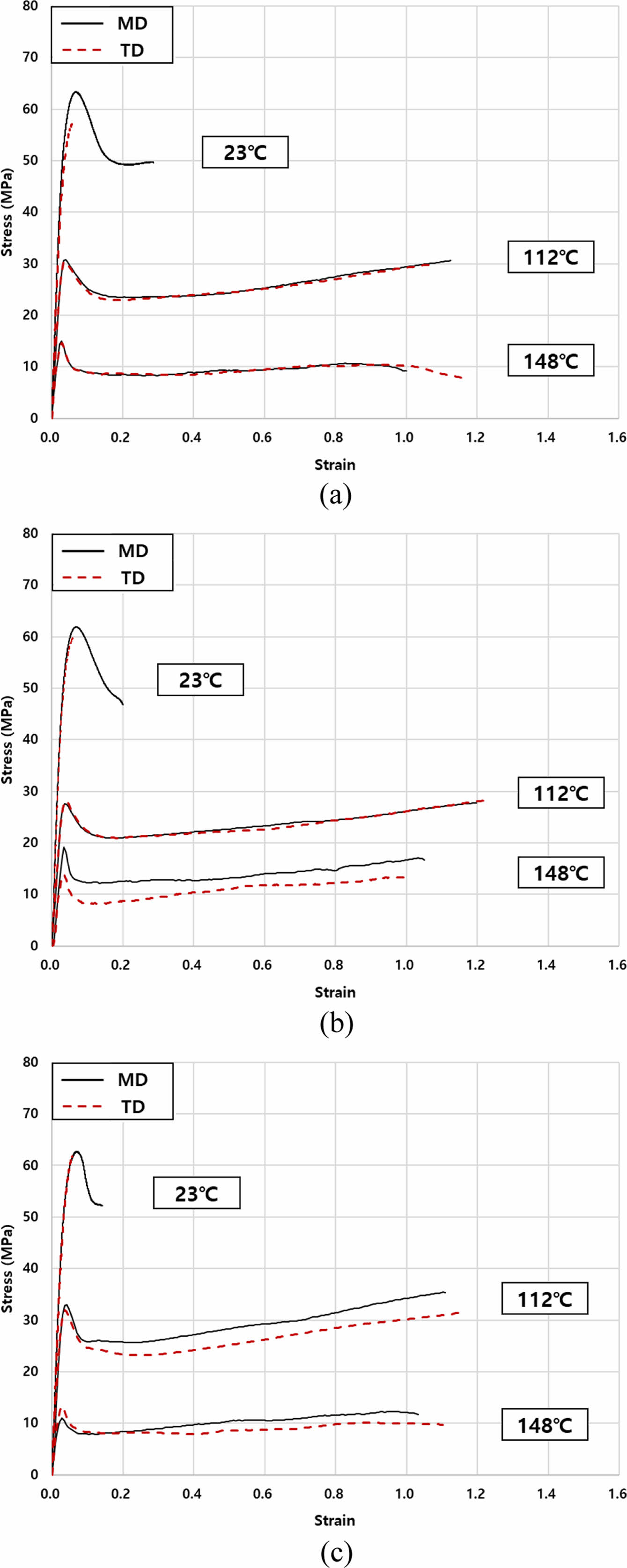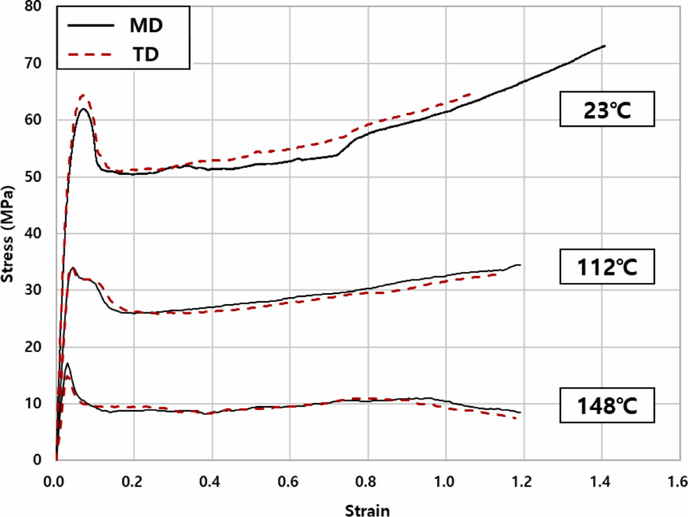 필름의 MD와 TD의 물성 값을 비교하면, 항복응력의 경우 상온에서는 TD에서 다소 크게 나타났고, 112 ℃와 148 ℃에서는 MD가 다소 컸다. 그러나 그 차이는 작았다. 인장강도의 경우 모든 온도에서 MD에서 크게 나타났다. 상온에서는 차이가 컸으나 Tg에서는 차이가 크지 않았다. 탄성계수의 경우 상온 및 고온에서 큰 차이가 없었다. 파단 연신율의 경우 상온과 112 ℃에서 MD가 크게 나타났으나 Tg에서는 TD가 크게 나타났다. 프와송 비의 경우 모든 온도에서 MD가 크게 나타났으나 Tg에서는 그 차이가 매우 작았다. 높은 온도에서는 물성의 이방성이 매우 작게 나타났다.
