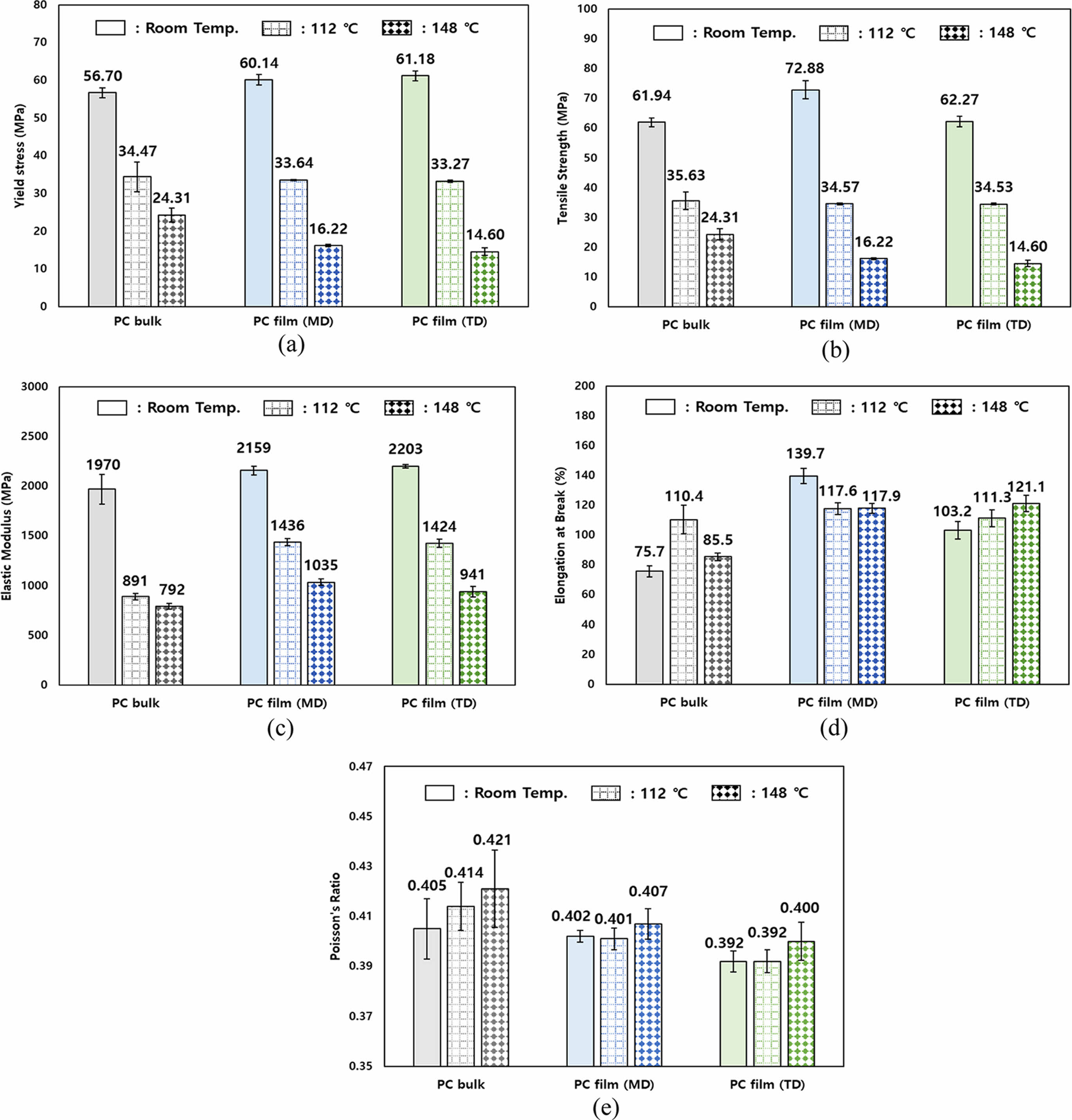 Figure 8에 PC 벌크 소재와 필름의 기계적 물성을 비교하였다. 상온에서 PC 필름이 PC 벌크 소재보다 항복응력과 인장강도가 크게 나타났다. 필름은 제조하는 과정에서 분자의 배향으로 물성이 향상된 것으로 판단된다. 그러나 112℃와 148℃에서는 PC 벌크 소재의 항복응력과 인장강도가 필름보다 더 크게 나타났다. 또한 PC 필름의 탄성계수가 벌크 소재보다 모든 온도에서 높게 나타났다. Figure 8(d)에 나타난 파단 연신율은 모든 온도에서 PC 필름이 벌크 소재보다 크게 나타났다. Figure 8(e)에는 PC필름과 벌크 소재의 프와송 비가 나타나 있다. 벌크 소재가 필름보다 프와송 비가 컸으며 온도 상승에 따라 프와송 비가 증가하는 경향을 보였다. PC 필름의 경우 상온과 112 ℃에서 유사한 값을 보이나 Tg인 148 ℃에서는 크게 증가하였다. 이를 통해, PC 필름은 프와송 비가 고무 물성을 보이는 Tg에서 크게 변함을 알 수 있다.