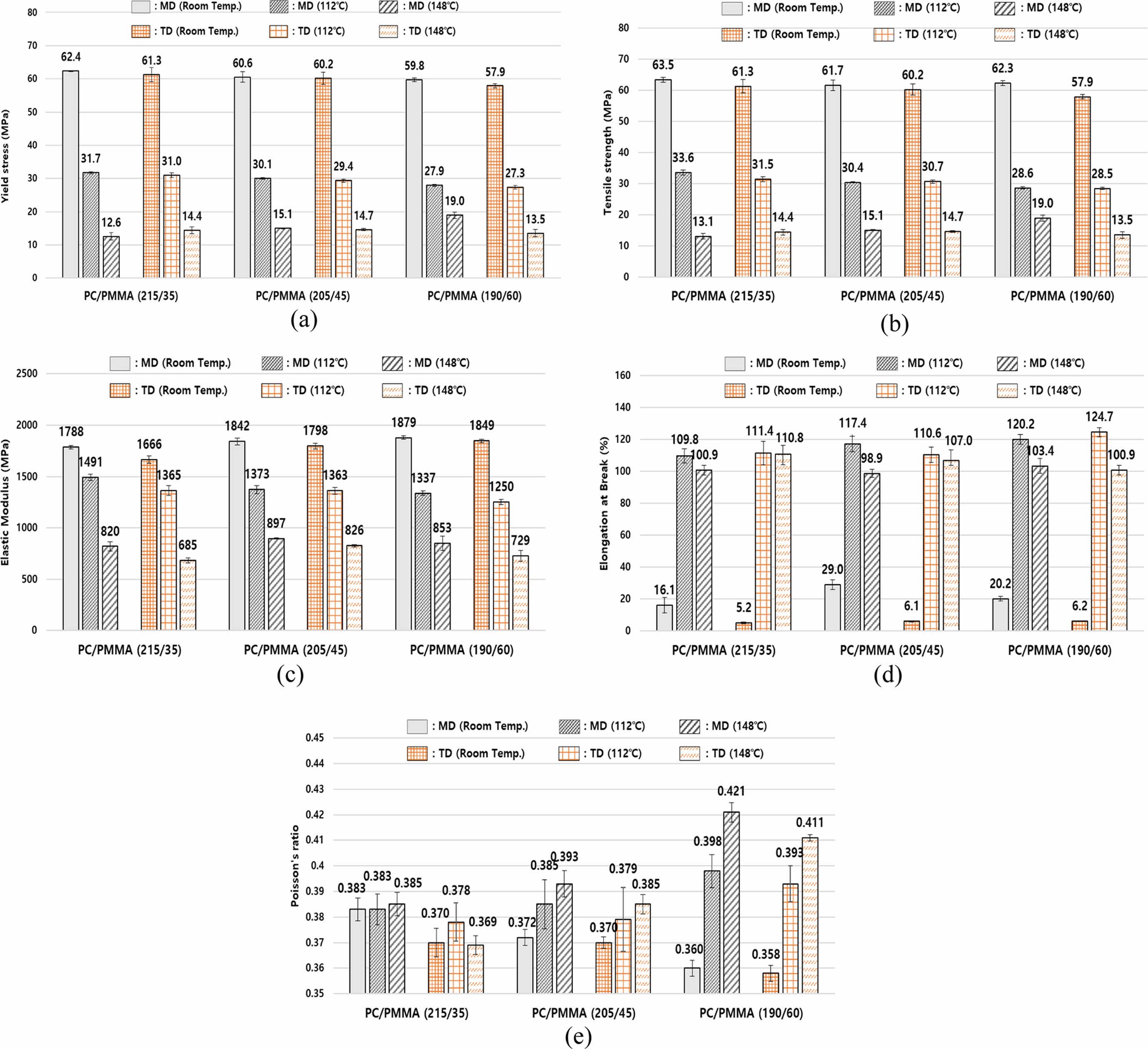 PMMA 층 두께에 따른 물성 비교: Figure 10에 PC/PMMA 다층 필름의 층 두께비에 따른 기계적 물성이 나타나 있다. Figure 10(a), (b)에 나타난 항복응력과 인장강도는 PMMA 층 두께가 두꺼울수록 다소 감소하는 경향을 보였다. 항복응력과 인장강도는 온도가 증가함에 따라 감소하나 112 ℃에서는 상온에 비해 크게 감소하였으며 PMMA 층의 두께가 두꺼울수록 다소 더 감소하였다. 이는 PMMA의 Tg가 PC 보다 낮아서 PMMA의 Tg에서 기계적 물성이 크게 감소하기 때문인 것으로 판단된다. 148 ℃에서 항복응력과 인장강도는 PMMA 층이 두꺼울수록 증가하는 경향을 보였다. 다만 PMMA층이 가장 두꺼운 경우 TD의 항복 응력과 인장강도는 감소하였다. 항복응력과 인장강도는 대체로 MD가 TD보다 높았다. Figure 10(c)에 나타난 탄성계수는 상온에서 PMMA 층의 두께가 두꺼울수록 증가하는 경향을 보였다. 이는 상온에서 PMMA 벌크 소재의 탄성계수가 2719 MPa로 PC 벌크 소재의 탄성계수 1970 MPa보다 크기 때문으로 판단된다. 그러나 112 ℃에서는 상온의 결과와 달리 PMMA 층 두께가 두꺼울수록 탄성계수가 감소하였다. 이는 상온과 112 ℃에서 PC와 PMMA의 벌크 소재의 탄성계수가 각각 1970 MPa, 2719 MPa에서 891 MPa, 334 MPa로 감소하는데 PMMA가 상온에 비해 112 ℃에서 탄성계수가 크게 감소하기 때문인 것으로 판단된다. Figure 10(d)에 나타낸 파단 연신율은 상온에서 가장 작았으며 PMMA 층의 두께가 두꺼울수록 증가하였다. Figure 10(e)에 나타난 프와송 비는 온도에 따라 다른 경향을 보이는데 상온에서는 PMMA 층의 증가에 따라 감소하지만 112, 148 ℃에서는 PMMA 층 두께가 두꺼울수록 프와송 비가 증가하는 경향을 보였다. 이는 상온에서 PC보다 PMMA의 프와송 비가 작지만 112, 148 ℃에서는 PMMA가 PC보다 프와송 비가 크기 때문이다.