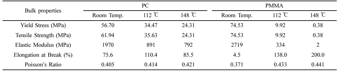PMMA의 Tg인 112 ℃에서는 항복점을 보이며 100%이상의 높은 파단 연신율을 보였다. PMMA의 Tg를 훨씬 넘는 148 ℃에서는 연신율에 따른 응력을 거의 보이지 않고 200% 수준의 매우 큰 파단 연신율을 보였다. 이를 통해 PMMA는 온도에 따른 기계적 물성 변화가 큰 소재라고 파악되었다. PC와 PMMA 벌크 소재의 기계적 물성 값이 Table 2에 나타나 있다. PC의 경우 항복응력, 인장강도 그리고 탄성계수가 온도 상승에 따라 감소하였다. 모든 온도에서 높은 파단 연신율을 보인 PC 소재는 인성(toughness)이 높은 소재로 판단된다. 또한 온도 상승에 따라 비례적으로 프와송 비가 0.405에서 0.421로 증가하였다.