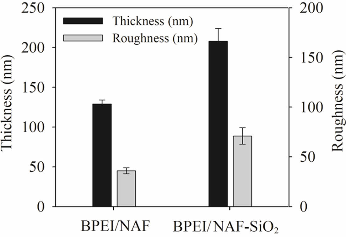 먼저 다층박막의 성장을 관찰하였다. Figure 1은 BPEI/NAF와 BPEI/(NAF-SiO2) 다층박막의 두께와 조도를 보여준다. SiO2 나노입자를 NAF 용액에 혼합한 경우, 박막의 두께는 129 nm에서 208 nm로 크게 증가하였다. 그리고, 조도도 36 nm에서 71 nm로 크게 증가하였다. 이는 NAF 용액에 SiO2를 혼합함으로써, 다층박막에 SiO2 나노입자가 효과적으로 함유되었다는 것을 의미하며, 그로 인하여 조도가 증가하였음을 알 수 있다.