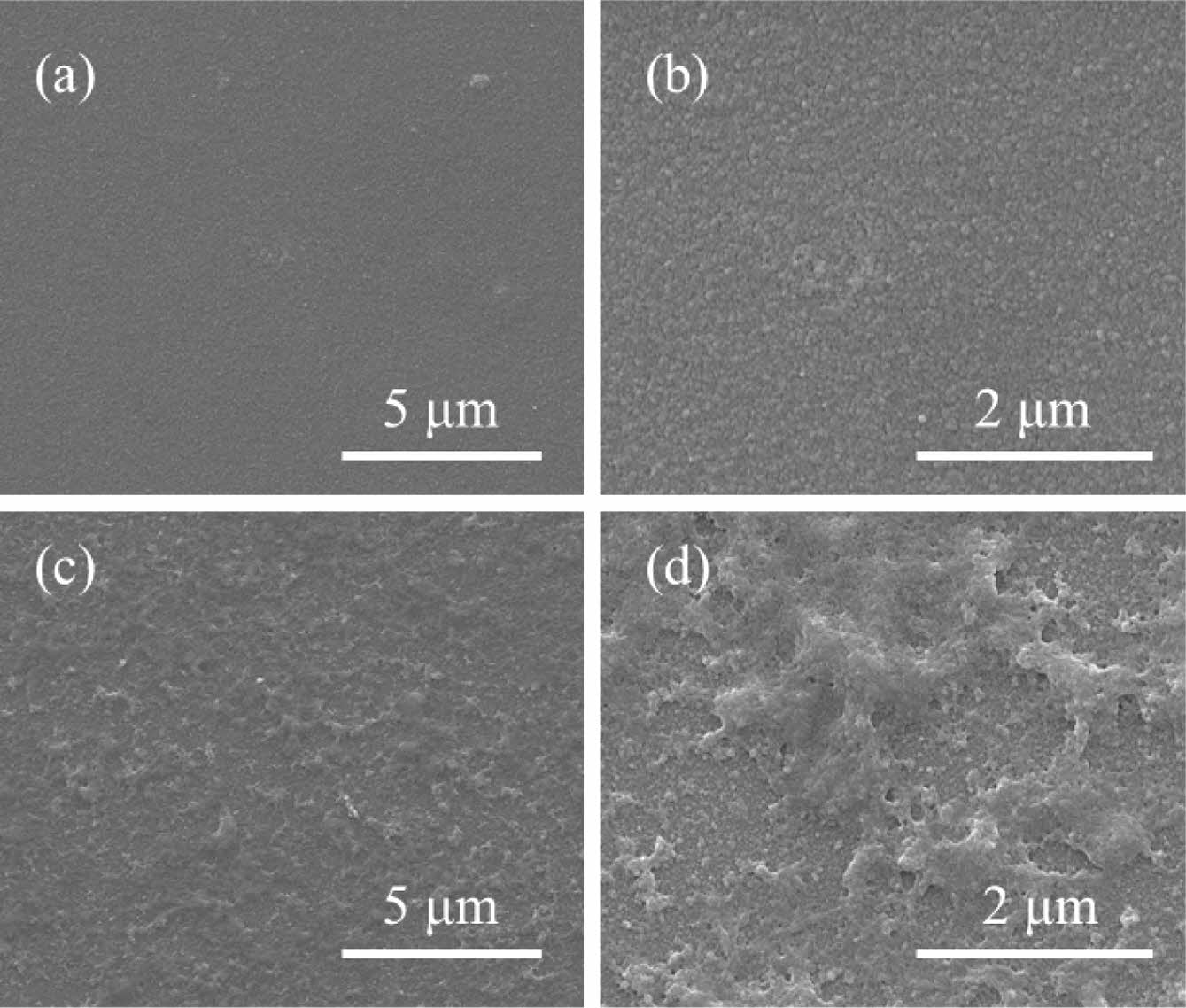 Figure 2는 다층박막의 SEM 표면 사진이다. SiO2 나노입자가 첨가된 경우 표면의 조도가 크게 상승하 였다. 저배율에서 관찰하는 경우(Figure 2(a), (c)), BPEI/NAF 다층박막의 표면은 매끄럽게 보이며, 반면 BPEI/NAF-SiO2 다층박막에서는 표면에 엉겨 붙어있는 모폴로지를 선명하게 볼 수 있다. 배율을 조금 더 높여서 보면(Figure 2(b), (d)), BPEI/NAF 다층박막에서 나노 스케일의 요철구조가 관찰되며, BPEI/NAF-Ludox 다층박막에서는 엉겨 붙은 구조가 더 선명하게 관찰되었다.