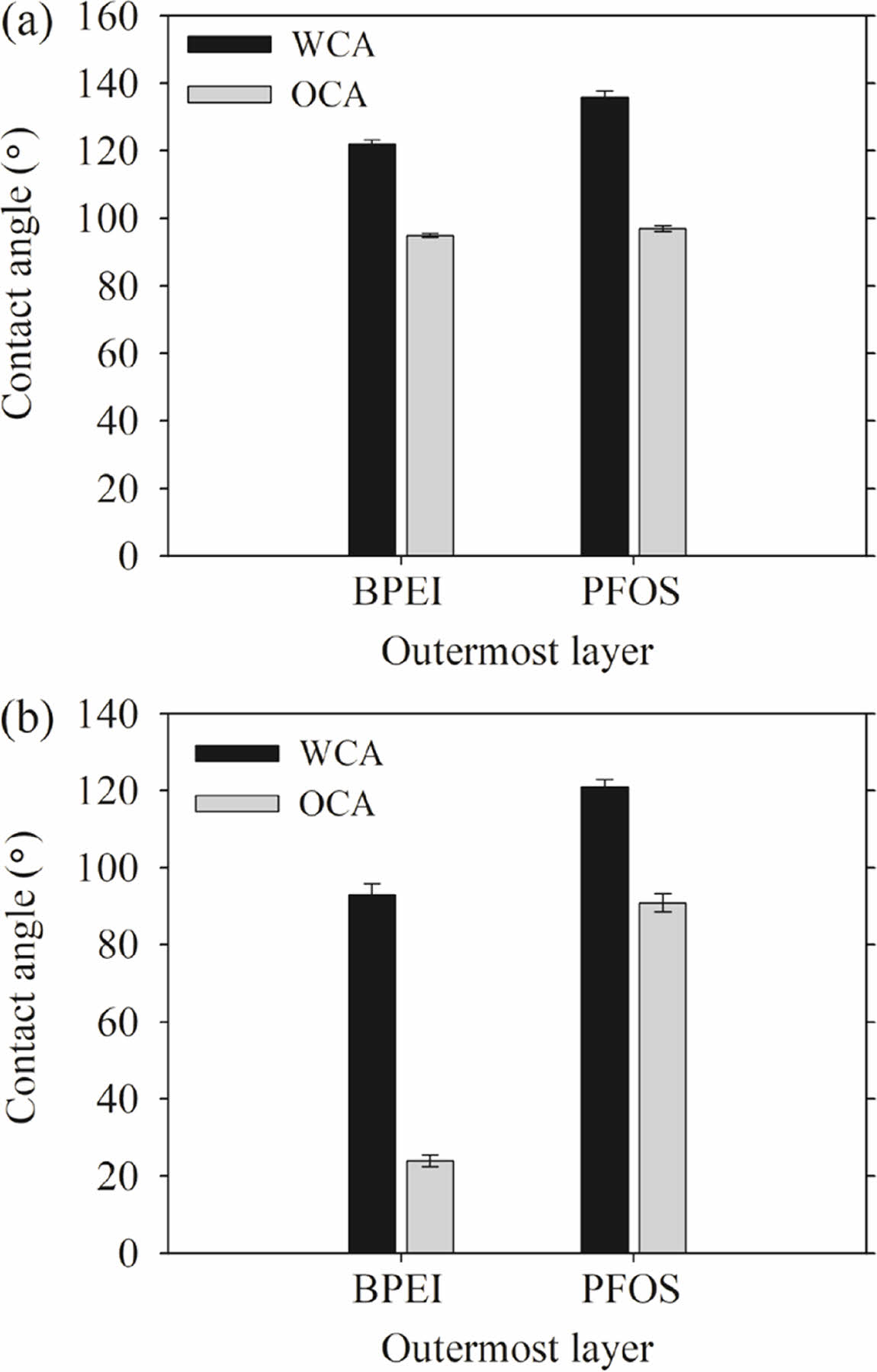 다음으로 제조된 다층박막의 WCA와 OCA를 관찰하였다. 다층박막의 접촉각은 최외각층이 BPEI이거나 PFOS인 2가지 경우에 대해 측정하였다. Figure 3(a)는 BPEI/NAF 다층박막의 접촉각을 보여준다. BPEI가 최외각층인 경우, WCA=122°, OCA=95°로 표면은 소수성 특성을 나타냈다. 이는 다층박막에 불소원자를 다량 함유하고 있는 NAF가 사용되었기 때문이다. PFOS로 처리된 다층박막의 경우 접촉각은 WCA=136°, OCA=97°로 나타났다. PFOS 처리를 통하여 WCA는 소폭 증가하였고, OCA는 큰 변화가 나타나지 않았다.