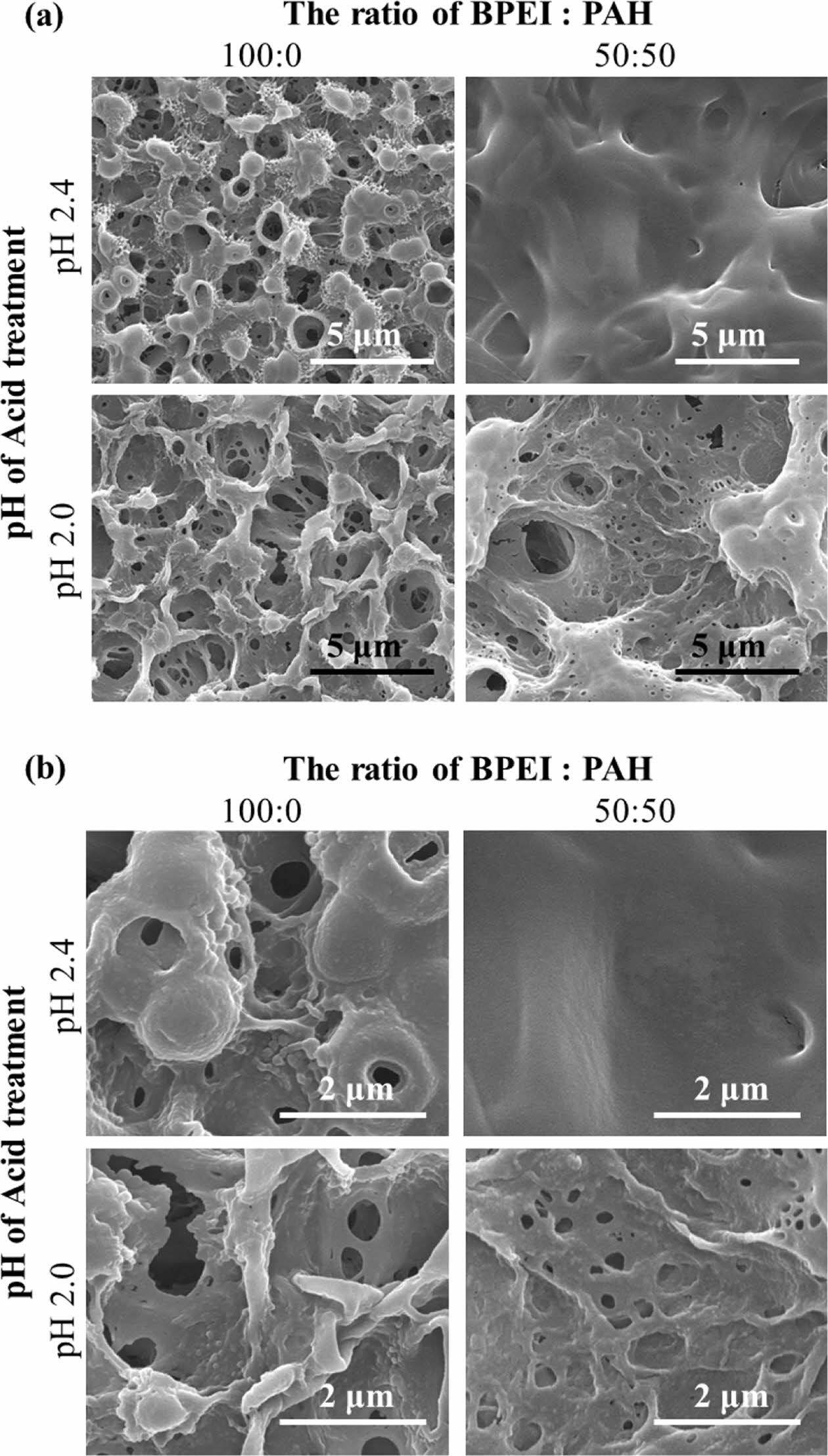 BPEI:PAH 혼합비율이 50:50인 경우, 기공구조가 pH에 따라 다르게 나타났다. pH 2.4에서는 표면의 조도는 컸으나 마이크로 기공은 관찰되지 않았다. 그러나 pH 2.0에서는 분화구 같은 구조에 작은
