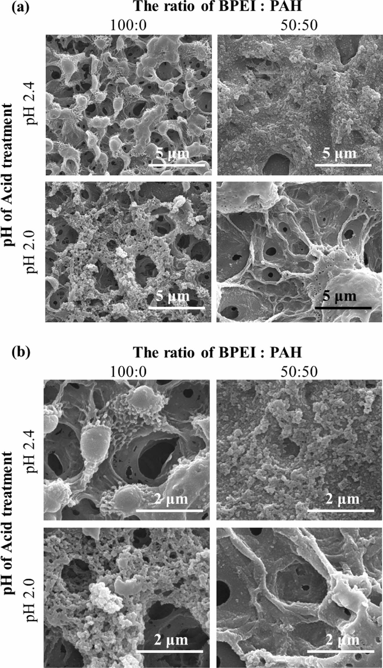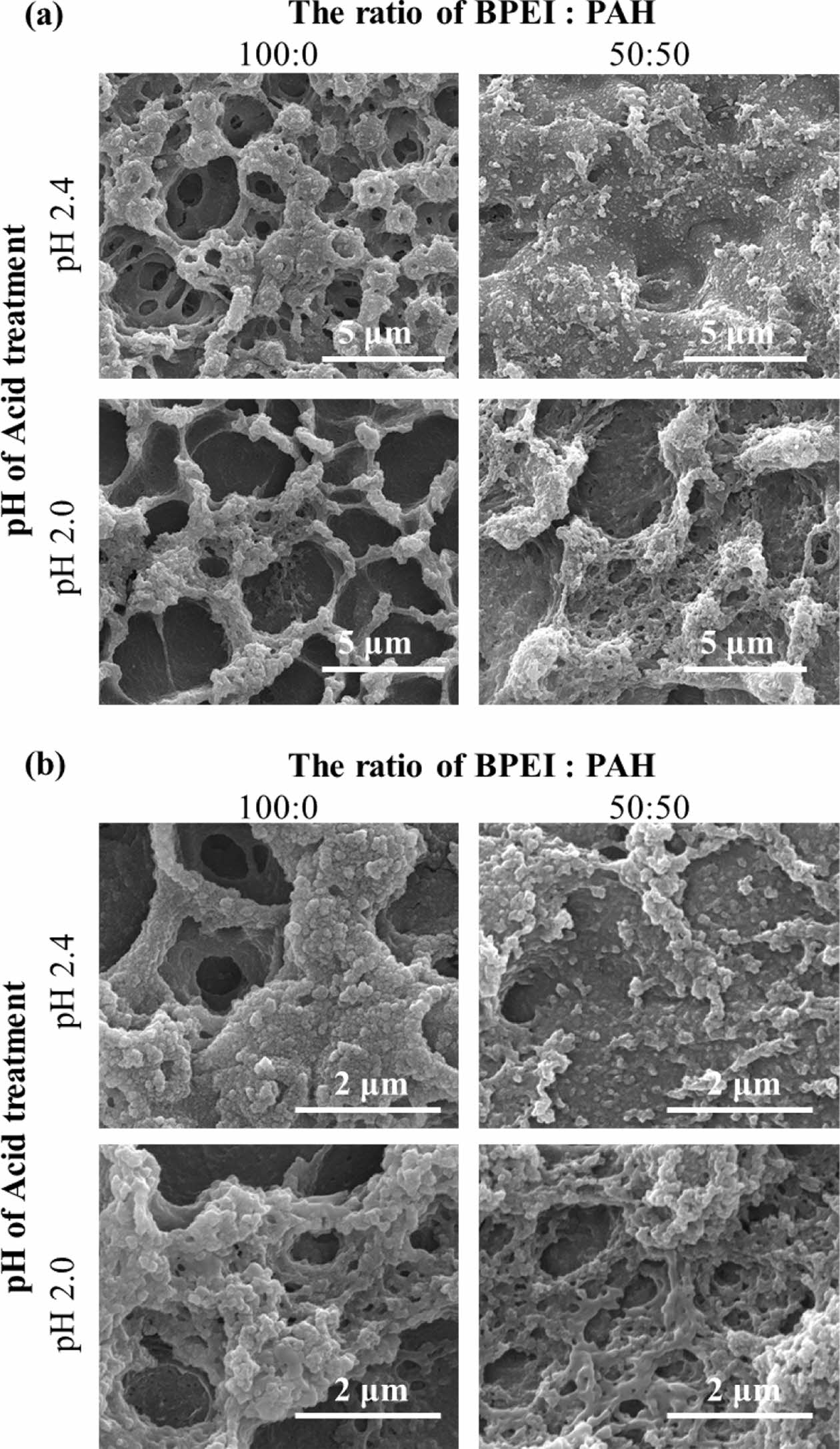 다음으로 필름의 표면 계층구조를 유도하기 위해 2층구조 다층박막을 제조하였다. Figure 4는 BPEI/PAH 혼합 조건 및 산처리 pH에 따른 다공성 다층박막의 SEM 사진이다. Figure 4(a) 저배율의(×10000) SEM 사진을 통해 다공성 구조를 선명하게 볼 수 있다. PAH 100%인 경우(BPEI:PAH=100:0), 산처리 pH 2.4와 pH 2.0 모두에서 마이크로스케일 크기의 기공구조가 관찰되었다.