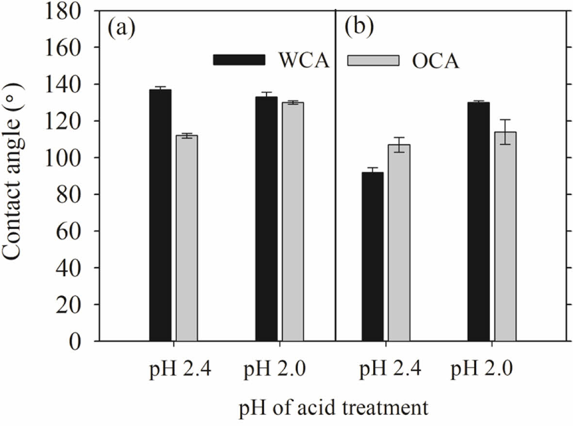 BPEI:PAH=50:50, pH 2.4의 경우는 WCA와 OCA가 120° 이하로 비교적 낮게 나타났으며, 이는 Figure 5(a)에서 볼 수 있는 바와 같이 다른 조건에 비해 다공성 구조가 약하기 때문으로 판단된다.