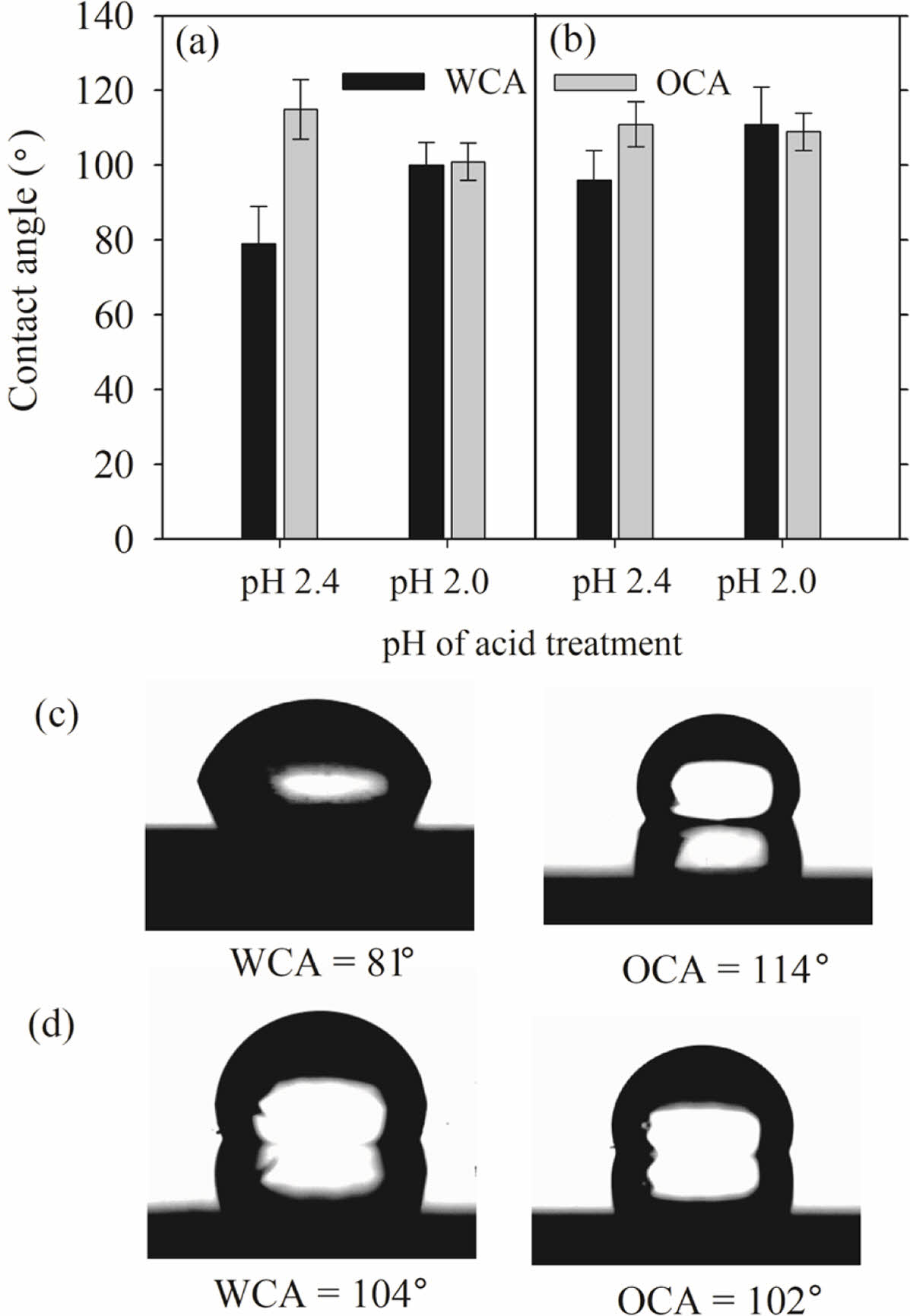Figure 8 . Contact angles of BPEI/NAF-SiO2 LbL film-coated porous films. BPEI:PAH ratios of (a) 100:0; (b) 50:50 were used for the preparation of porous films. Images of water and oil droplets on the films of (a) that acid-treated at (c) pH 2.4; (d) pH 2.0. |