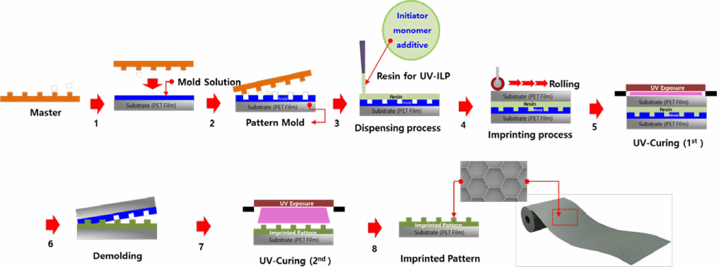 UV-ILP에 사용되는 패턴 필름을 제작하기 위해서는 첫번째, 표면처리가 진행된 몰드의 표면에 광 경화성 액상 레진을 3 mL 정도 도포한다. 두번째, 도포 진행된 광 경화성 액상 레진 위에 PET 필름을 올리고 UV를 6초 이내로 조사하여 1차 경화인 가경화를 진행한다. 마지막으로, PET 필름를 분리하고 몰드의 패턴이 전사 진행된 임프린트 패턴 필름(PET 필름)에 다시 UV를 11초 이내로 추가 조사하여 2차 경화인 본경화를 진행한다. UV-ILP를 통한 패턴 필름의 제조공정의 개략도는 Figure 1에 나타내었다.