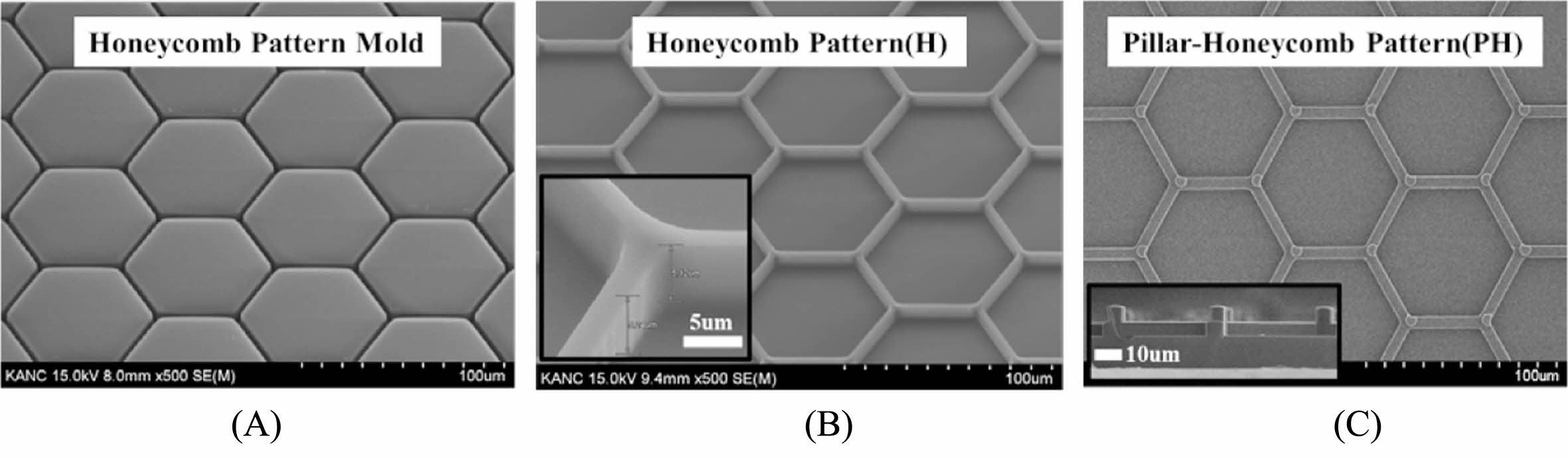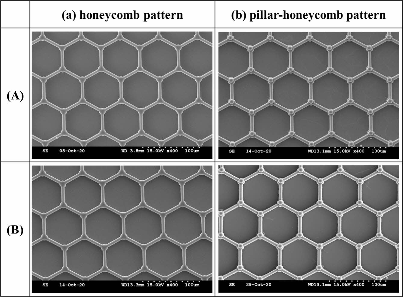 몰드 및 패턴 필름 제조. UV-ILP(sample 2)을 통해육각 패턴과 pillar-honeycomb 패턴이 형성된 필름이 제조되었다. Figure 2에 패턴 몰드와 패턴의 SEM images를 나타내었다. 패턴 mold의 형상이 PET 필름 위에 잘 형성되었으며, 육각 패턴의 높이는 5 um 수준이며, pillar-honeycomb의 높이는 pillar 포함하여 10 um 수준임을 SEM을 통해 확인하였다.