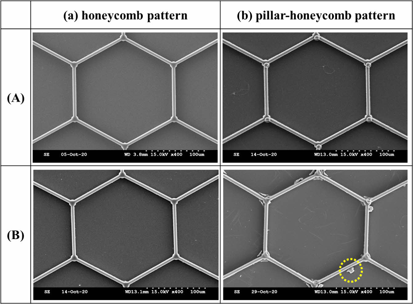 Rubbing test 전과 후의 패턴 표면 형상의 유의차가 확인되지 않아 기판과의 패턴 밀착성과 전사성이 우수한 것으로 판단된다. 또한, honeycomb 패턴에 대하여 Rubbing test 전과 후의 표면 접촉각의 변화를 확인할 때, Table 1에 나타내었듯이 표면 접촉각의 유의차는 확인되지 않아 표면 특성의 변화는 없는 것으로 판단된다. 그러나, Figure 4에 결과에서 처럼, honeycomb 패턴 간의 거리(pitch)가 2배이상 증가한 pillar-honeycomb 패턴에서는 rubbing test 후에 pillar가 손상되어 분리되는 현상을 확인할 수 있어, 패턴에 pillar 적용시에는 패턴 간의 최적의 pitch 간격을 고려하여 패턴를 형성하여야 할 것으로 판단된다. pitch 간격이 크면 rubbing시 pillar에 가해지는 순간 강도(strength)가 증가하여 pillar에 가해지는 응력으로 인한 피로(fatigue)의 증가로 손상이 발생될 수 있는 것으로 추정된다. 이 부분에 대한 pillar의 fatigability에 대한 추가적인 연구는 계속적으로 수행되어야 할 것으로 판단된다.