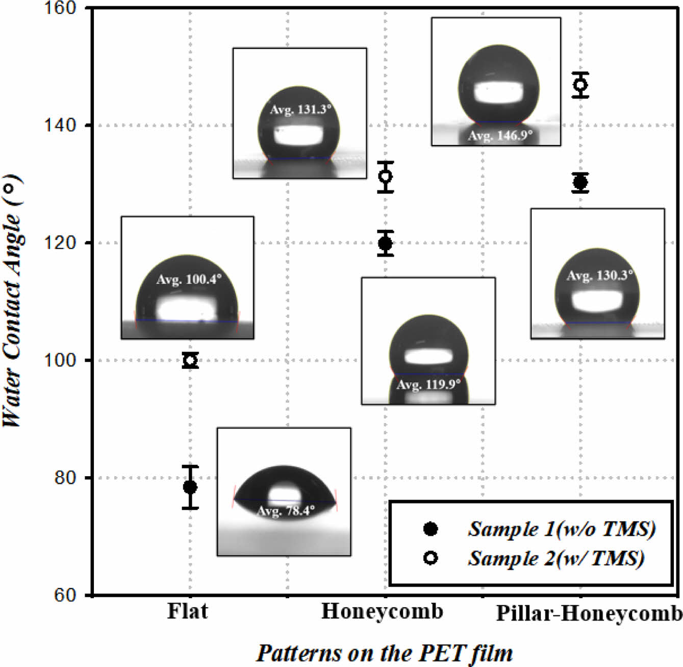 패턴 필름의 발수 특성 분석. TMS group이 포함되지 않은 sample 1 레진과 포함된 sample 2 레진을 각각 배합 제조하여 UV-ILP 공정을 통해 평탄 표면, 육각 패턴 표면 그리고 pillar-honeycomb 패턴 표면 필름의 발수 특성을 접촉각 측정기로 통해 분석하였고, Figure 5에 그 결과를 나타내었다.