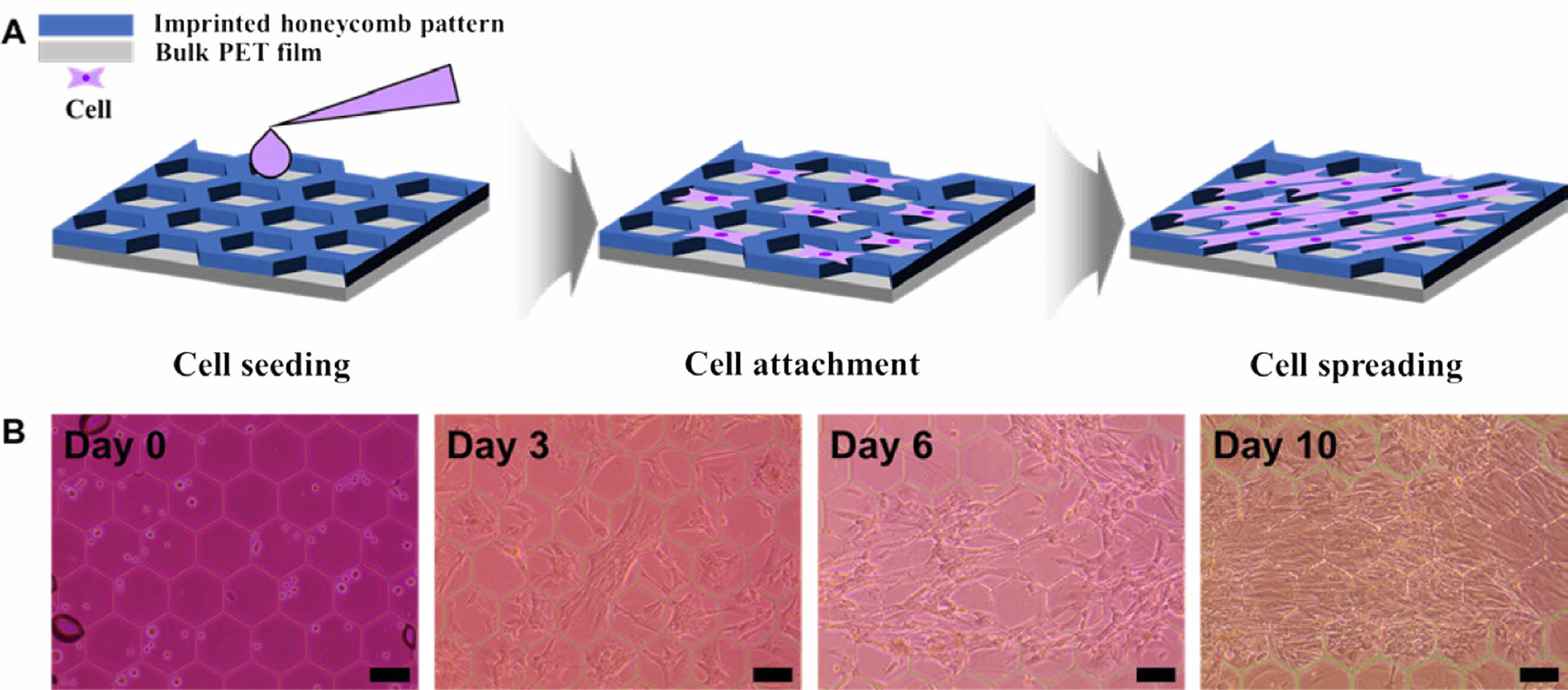 Figure 6 (A) Schematic description of cultivation of human dermal fibroblasts (HDFs) on the imprinted honeycomb pattern film; (B) bright images are proliferation of HDFs on the imprinted honeycomb pattern film. |