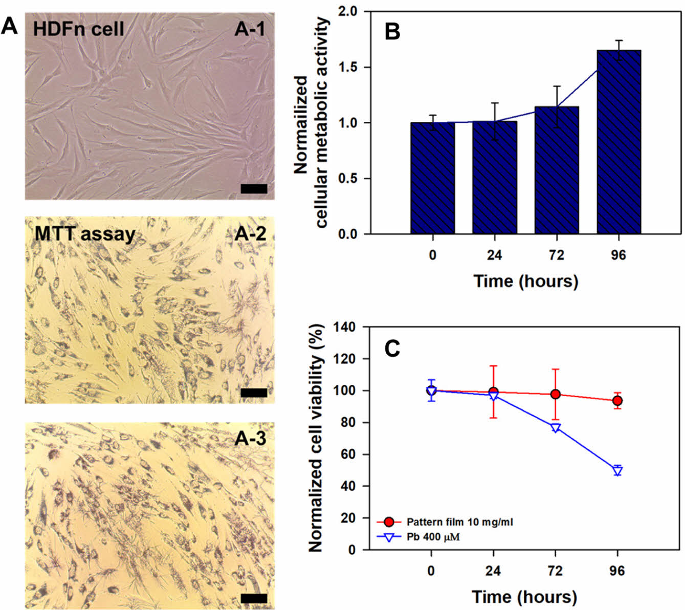 Figure 7 (A) Bright images are MTT assay for cytotoxicity by imprinted honeycomb pattern film extract; 0 h (A-1), 24 h (A-2), and 72 h (A-3). (scale bar : 100 µm); (B) The cellular metabolic activity measured at each time was normalized to the metabolic activity characterized right after cell stabilization on well; (C) The cell viability measured at each time was normalized to the characterized pure medium group at each time, comparing to that of Pb. |