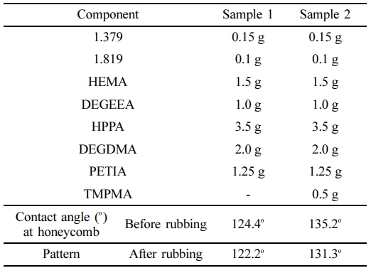 Table 1 Recipe of Materials for UV-Imprinting Resin and Water-Contact Angle Before & After Rubbing Test at Honeycomb Pattern |