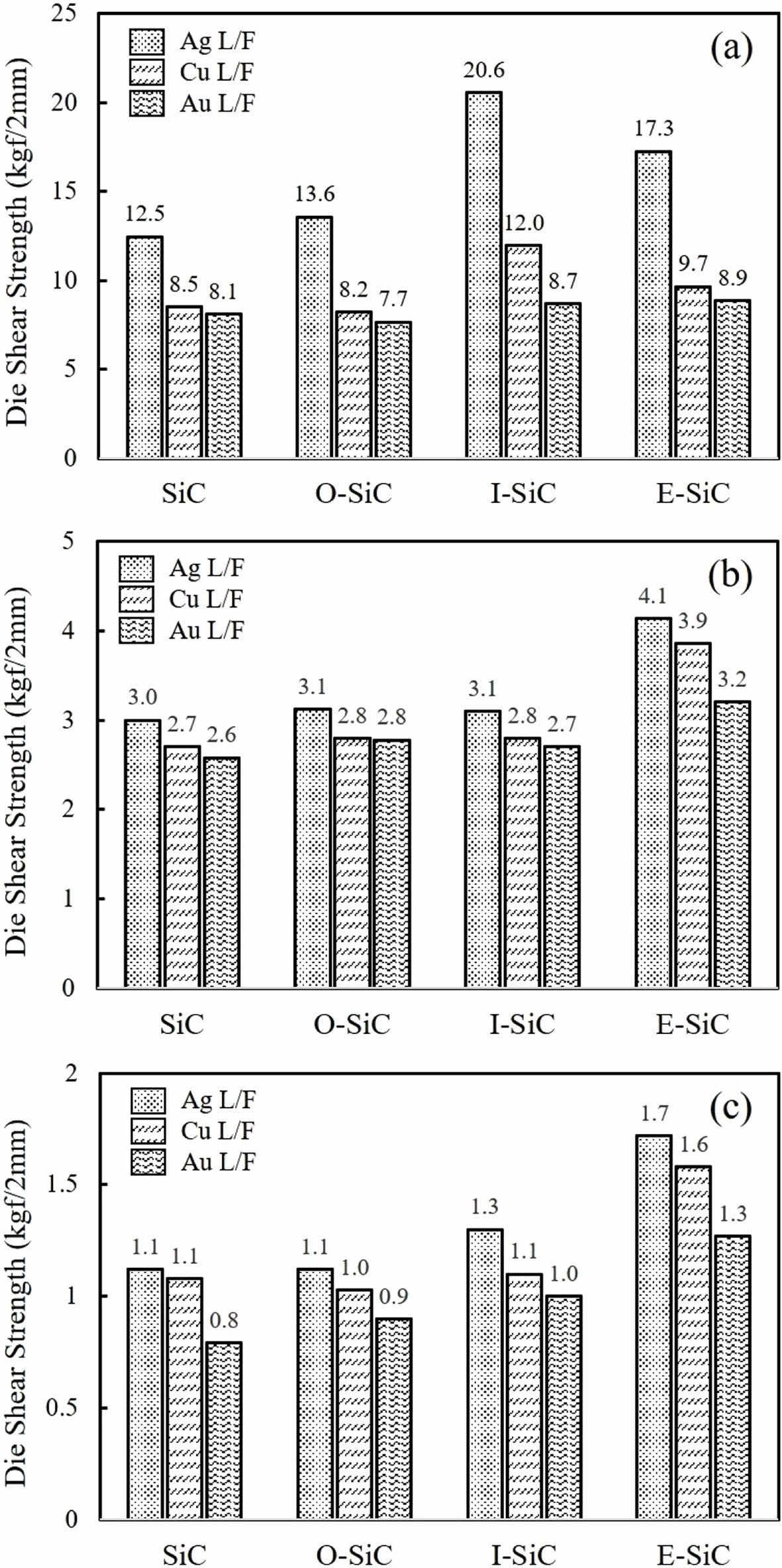 Figure 1 Die shear strength between silicon die and metallic lead frame including Ag-plated Cu, Cu, Au-plated Cu performed at (a) 25 ℃; (b) 180 ℃; (c) 250 ℃. |