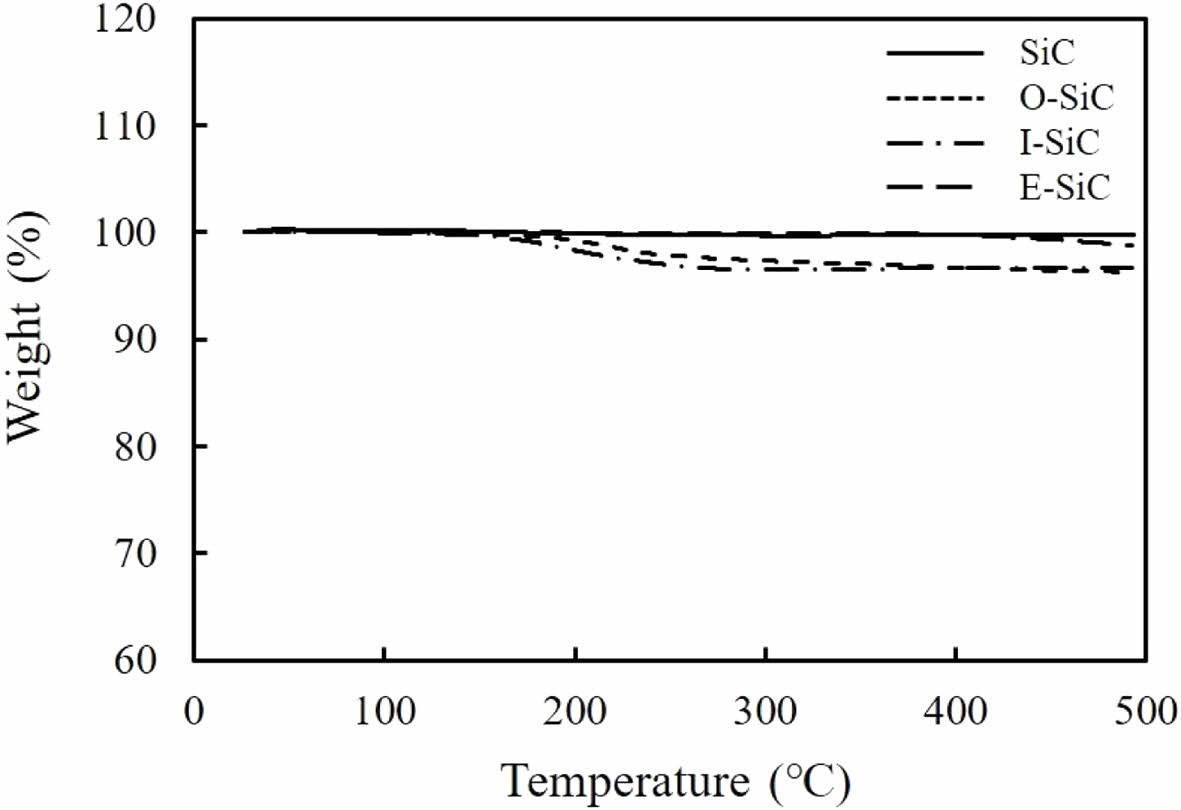 Figure 2는 미처리 순수 SiC와 표면 처리된 SiC 3종에 대한 TGA 곡선을 나타낸 것이다. 순수 SiC와 실란 커플링제로 처리된 SiC(E-SiC)는 측정된 온도 범위(~500 ℃)에서 중량의 변화가 거의 나타나지 않았으나, 올레산(O-SiC)과 이미다졸(I-SiC)은 200 ℃ 부근에서 중량이 감소하였다. 이는 실란 커플링제가 뛰어난 열적 안정성을 보유하고 있음을 의미한다. 올레산과 이미다졸의 끓는점이 각각 194, 240 ℃ 부근임을 고려할 때, 중량 감소는 필러 표면에서 처리제의 휘발에 기인한 것으로 생각된다. 실란 커플링제와 달리 SiC 표면에서 물리적으로 결합되어 있으며 끓는점 부근에서 불안정해지면서 궁극적으로 표면에서 분리된 것으로 보인다. 처리제가 기화되면 수지-필러간 계면에서 결함으로 작용하고 접착력을 포함하여 물성 저하의 원인이 될 수 있다. 실란 커플링제는 끓는점이 120 ℃ 부근으로 다른 처리제에 비해 낮지만 수지와 필러간 화학적으로 결합되어 있으므로 400 ℃ 이상에서도 중량 감소가 거의 나타나지 않았다.