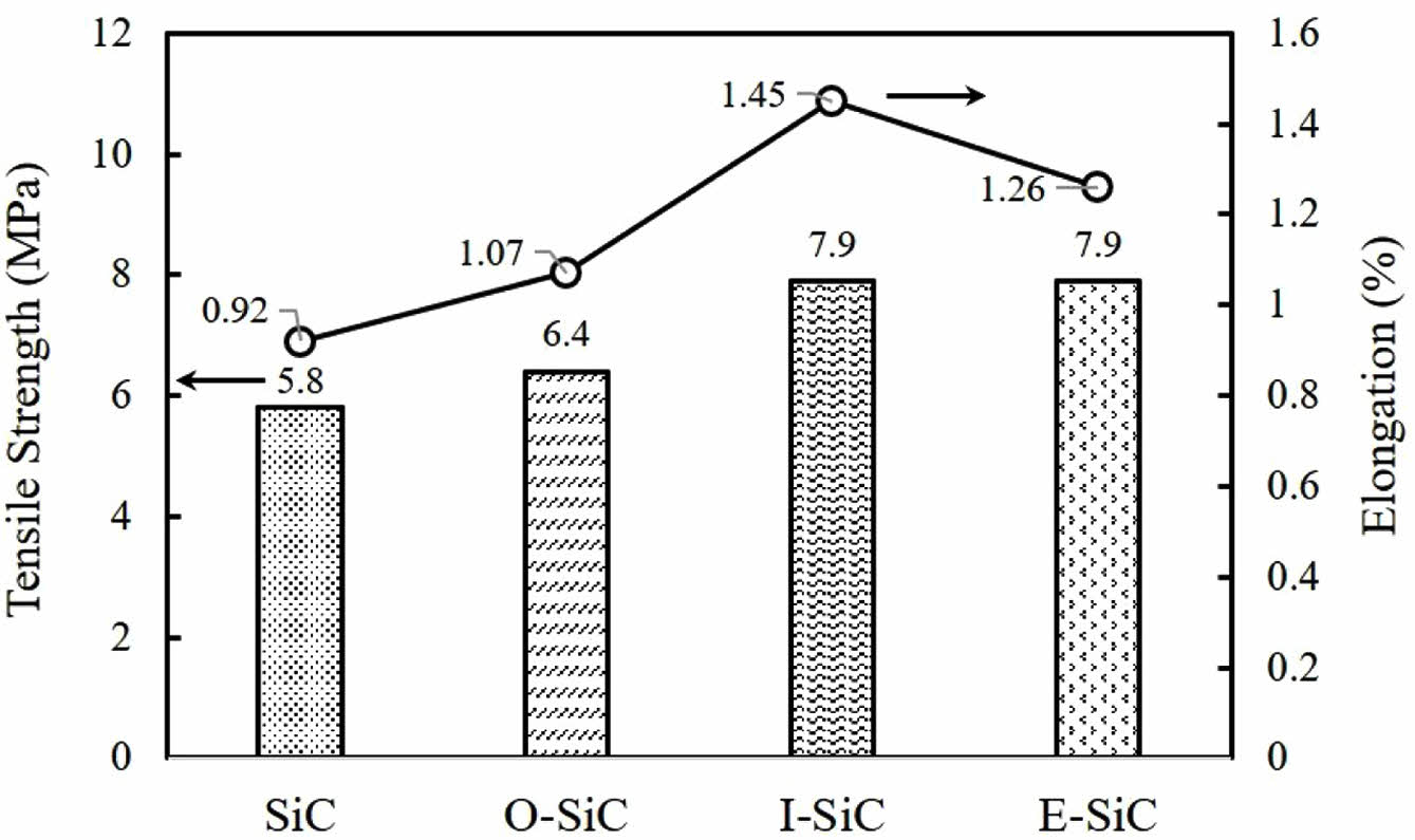Figure 3은 나노 SiC의 함량을 30 wt%로 고정한 상태에서 표면 처리에 따른 복합체의 인장강도와 신율을 보여준다. 처리되지 않은 순수 SiC가 첨가된 복합체의 인장강도는 5.8 MPa, 신율은 0.92%인 것으로 나타났다. 표면 처리에 의해 인장강도는 각각 6.4 MPa(O-SiC), 7.9 MPa(I-SiC), 7.9 MPa(E-SiC)로 상승하였다. 화학 결합에 참여하지 않는 O-SiC가 충전된 복합체는 분산성 향상으로 인해 증가한 것으로 생각되며 이미다졸과 에폭시 실란으로 처리된 복합체는 화학적 결합을 수반하여 2 MPa 이상 증가한 것으로 보인다. SiC 표면에 도입된 유기 관능기는 에폭시 수지와 필러간 결합력을 높이고 경화 밀도를 증진시켜 파괴될 때 더욱 높은 강도가 필요할 것으로 예상된다. 파단 신율 역시 인장강도와 유사한 경향을 보였고 특히 이미다졸로 처리된 복합체에서 1.45%를 보여 가장 높았고 에폭시 실란은 1.26%인 것으로 나타났다.