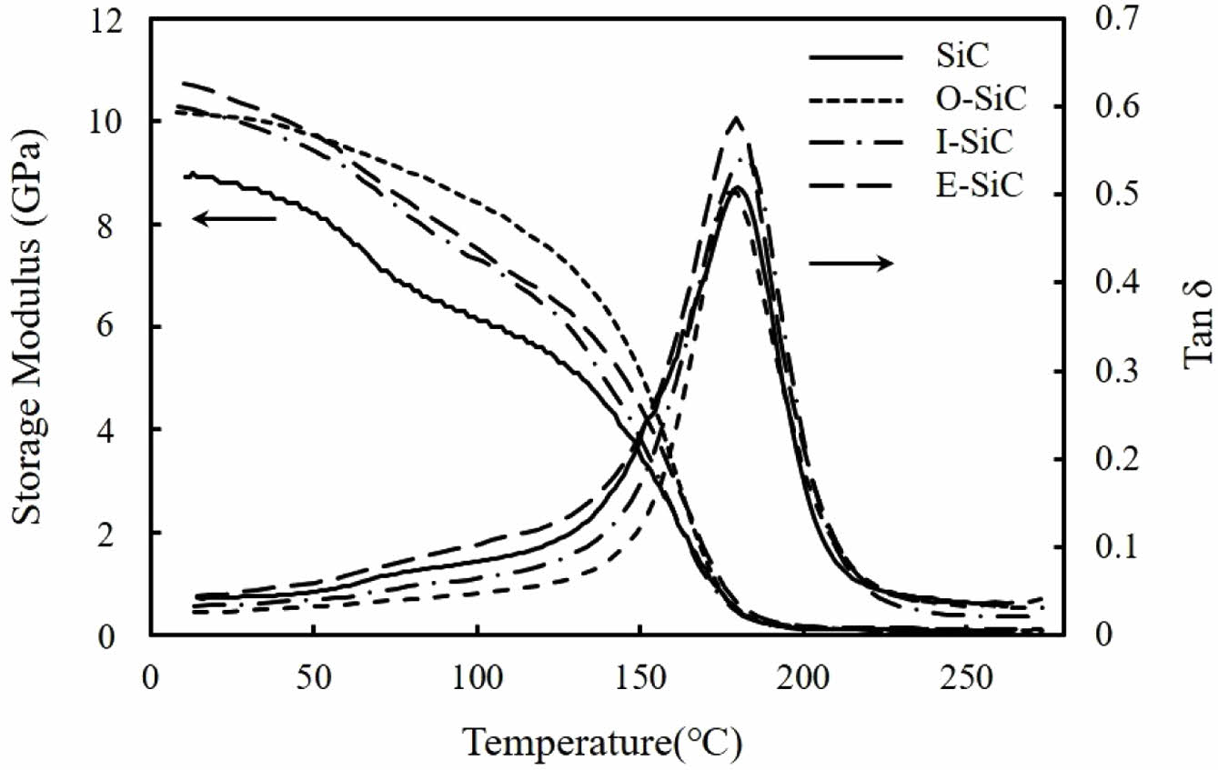 일반적으로 고분자 매트릭스에 무기 필러를 첨가했을 때 필러의 높은 값으로 인해 복합체의 저장탄성률은 증가한다. Figure 4에서 보여주는 바와 같이, 순수 SiC 나노 입자를 30 wt% 첨가한 복합체는 저장탄성률이 8.8 GPa를 보였고 온도가 상승함에 따라 감소하였다. 표면 처리된 SiC를 첨가할 경우, 저장탄성률이 더욱 증가하여 E-SiC는 10.4 GPa, I-SiC는 10.1 GPa, O-SiC는 10.1 GPa로 나타났는데 이는 SiC 나노 입자와 수지 간의 계면 결합력 또는 분산성이 향상되면서 보강에 의한 효과가 증가했기 때문이다. 필러의 표면 개질은 tan δ 곡선에도 영향을 미치는데, 순수 SiC가 첨가된 복합재의 tan δ 피크는 178 ℃ 부근에서 관찰되었고 E-SiC, I-SiC로 충전된 복합체는 180, 182 ℃로 약간 상승하였다. 실란 커플링제, 이미다졸은 에폭시 화합물의 가교 밀도를 증가시키고 이로 인해 높은 tan δ 피크가 높은 온도쪽으로 이동한 것으로 보인다. O-SiC로 처리된 복합체는 175 ℃에서 피크가 발견되어 오히려 감소하였는데 이는 반응에는 영향을 미치지 않고 오히려 가소 효과가 발생하여 낮아진 것으로 사료된다.