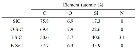 탄화규소 표면에 도입된 처리제의 존재 여부를 확인하기 위하여 에너지 분산 분광법(energy dispersive spectroscopy, EDS)로 분석을 진행하였다. Table 1은 주요 원소에 대한 atomic %를 보여준다. 미처리 순수 탄화규소는 Si, C, O로 구성되어 있으며 올레산(O-SiC)과 에폭시 실란(E-SiC)으로 처리된 탄화규소 역시 유사한 성분이 존재함을 확인하였다. 하지만 처리제의 종류에 따라 각각 C와 Si의 비중이 높았다. 이미다졸(I-SiC)의 경우 질소(N) 성분이 새롭게 발견되었다.