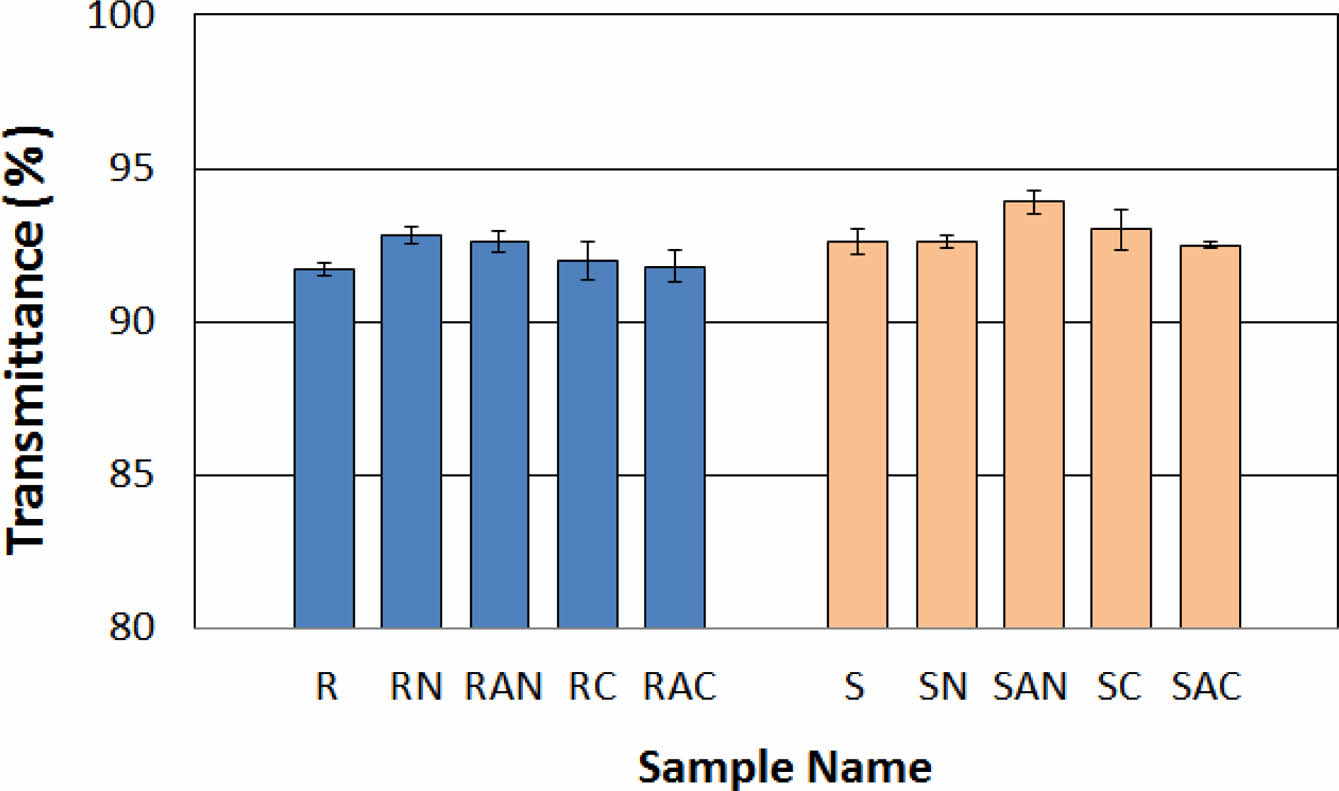 알지네이트에 의한 네트워크와 금속이온의 첨가 유무에 상관없이 모든 시료의 가시광선 광투과율은 90% 이상이다. 알지네이트로 IPN된 렌즈에 Na+ 이온을 첨가한 SAN의 광투과율이 93.9%로 가장 높게 나타났다.