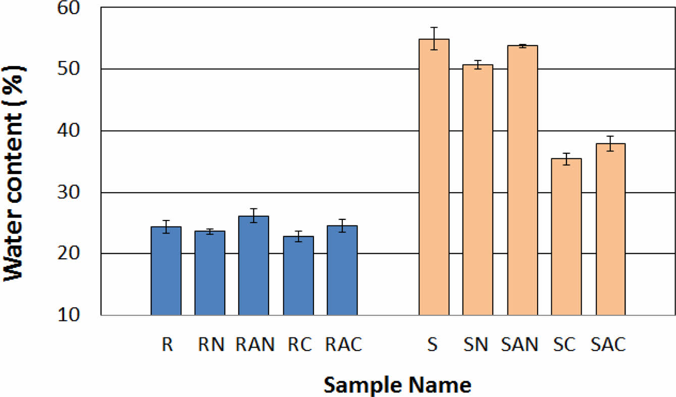 Na+가 가교된 비다공성(RN)과 다공성(SN) 시료의 함수율을 비교하면 SN의 함수율은 50.73%로 RN의 함수율인 23.60%에 비해 114% 향상되었다. 또한 알지네이트로 네트워크한 후 Na+를 가교시킨 시료인 RAN와 SAN의 함수율은 각각 26.19, 53.77%로 SAN의 함수율이 RAN의 함수율보다 약 105% 향상되었다.