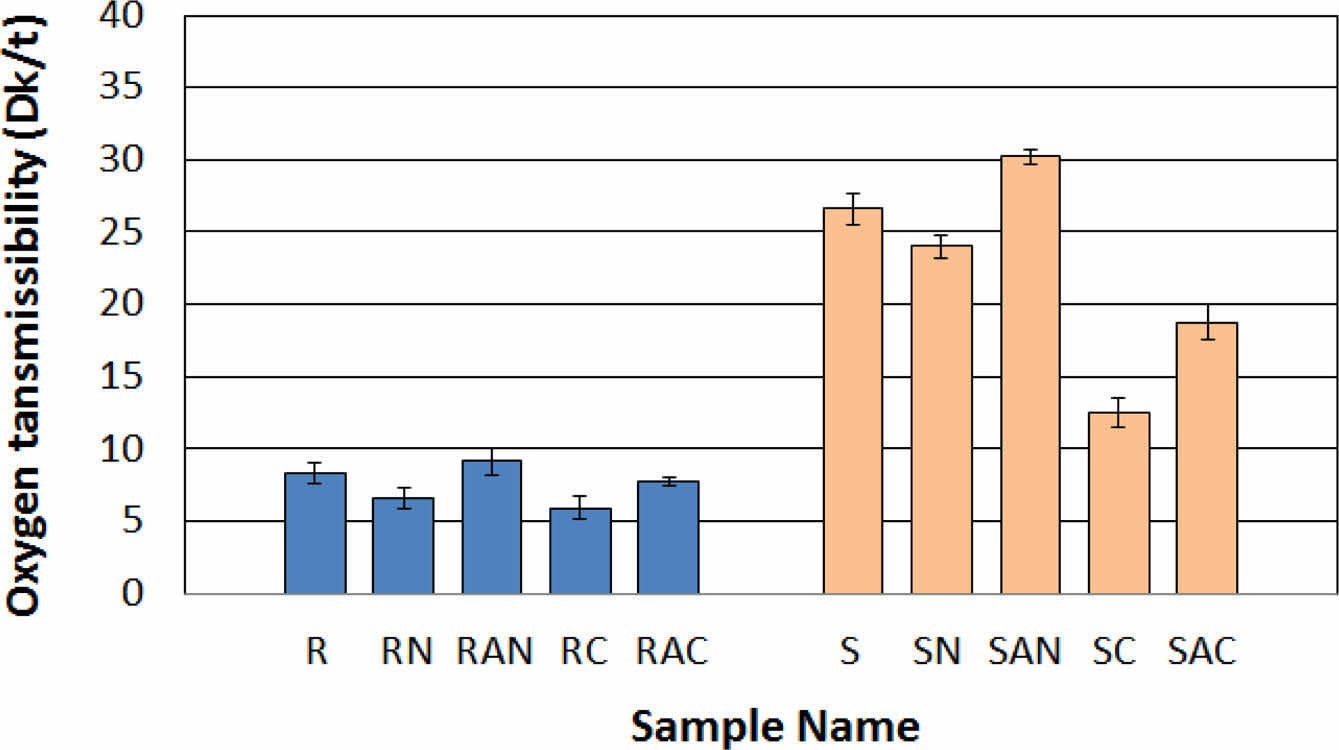 Ca2+이 첨가된 시료인 SC의 산소투과도는 12.47 Dk/t로 RC의 5.89 Dk/t보다 높다. 알지네이트로 IPN하고 Ca2+로 가교된 RAC와 SAC의 산소투과도는 각각 7.69 Dk/t, 18.75 Dk/t 로 각각 나타났다.