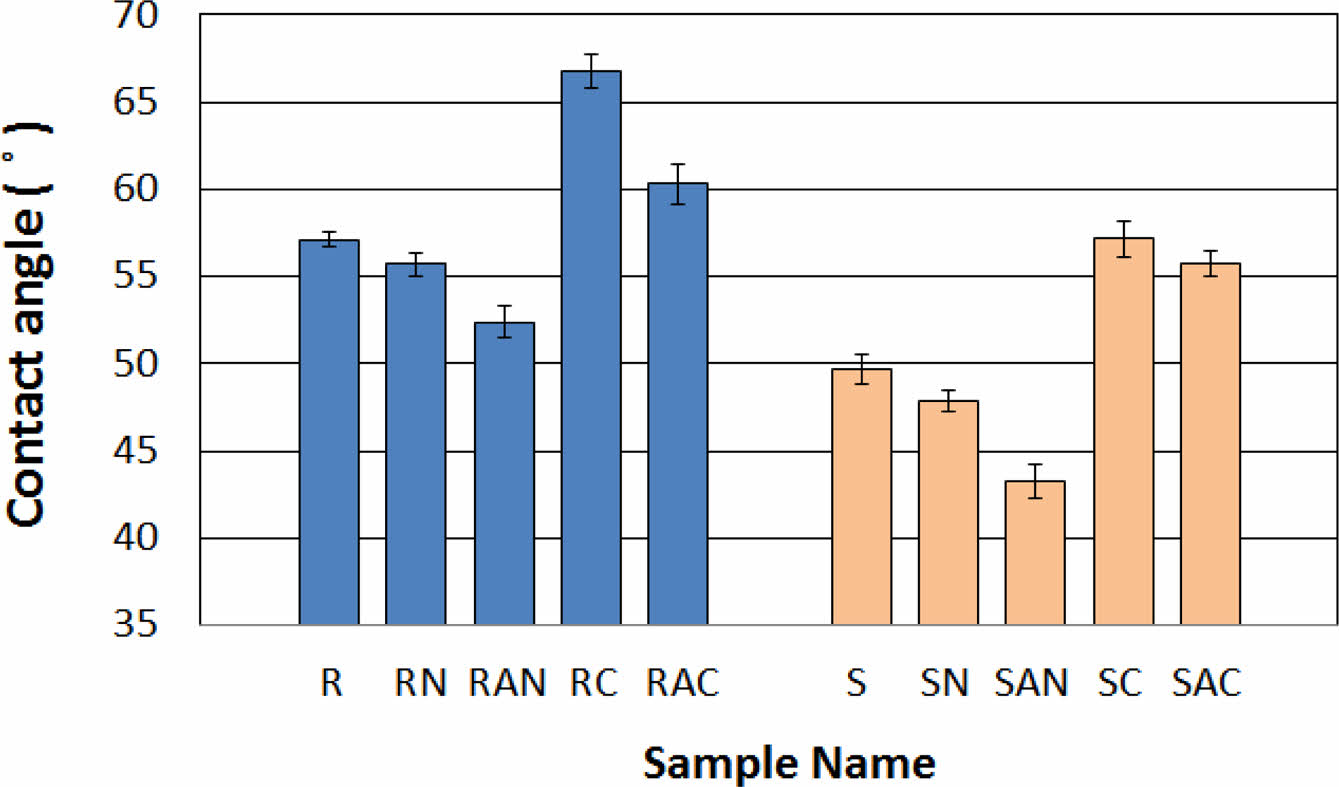 접촉각은 sessile drop방법으로 DSA-30(Kruss GMBH, Germany)을 사용하여 측정하였다. 시료는 24시간 동안 수화시킨 후 표면의 수분을 완전히 제거하고 초순수 3 mL를 시료의 표면에 떨어뜨려 생성된 각도를 5초동안 5회 측정하였다.