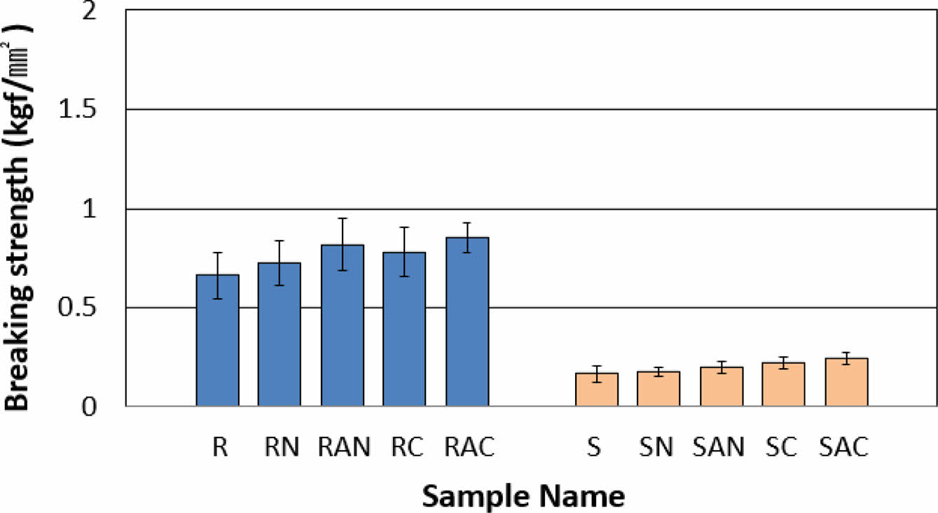 시료 R, S의 파단강도는 각각 0.67, 0.17 kgf/mm2로 나타나 다공성 하이드로젤인 경우에 파단강도가 매우 낮음을 확인하였다.