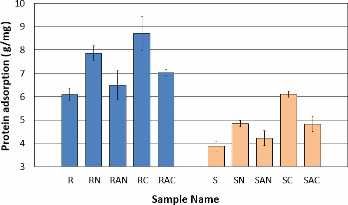 Na+가 첨가된 RN와 SN의 단백질 흡착량은 7.86 mg/g과 4.84 mg/g로 각각 나타났으며 이온이 첨가되기 전에 비해 단백질 흡착량이 증가되었다.