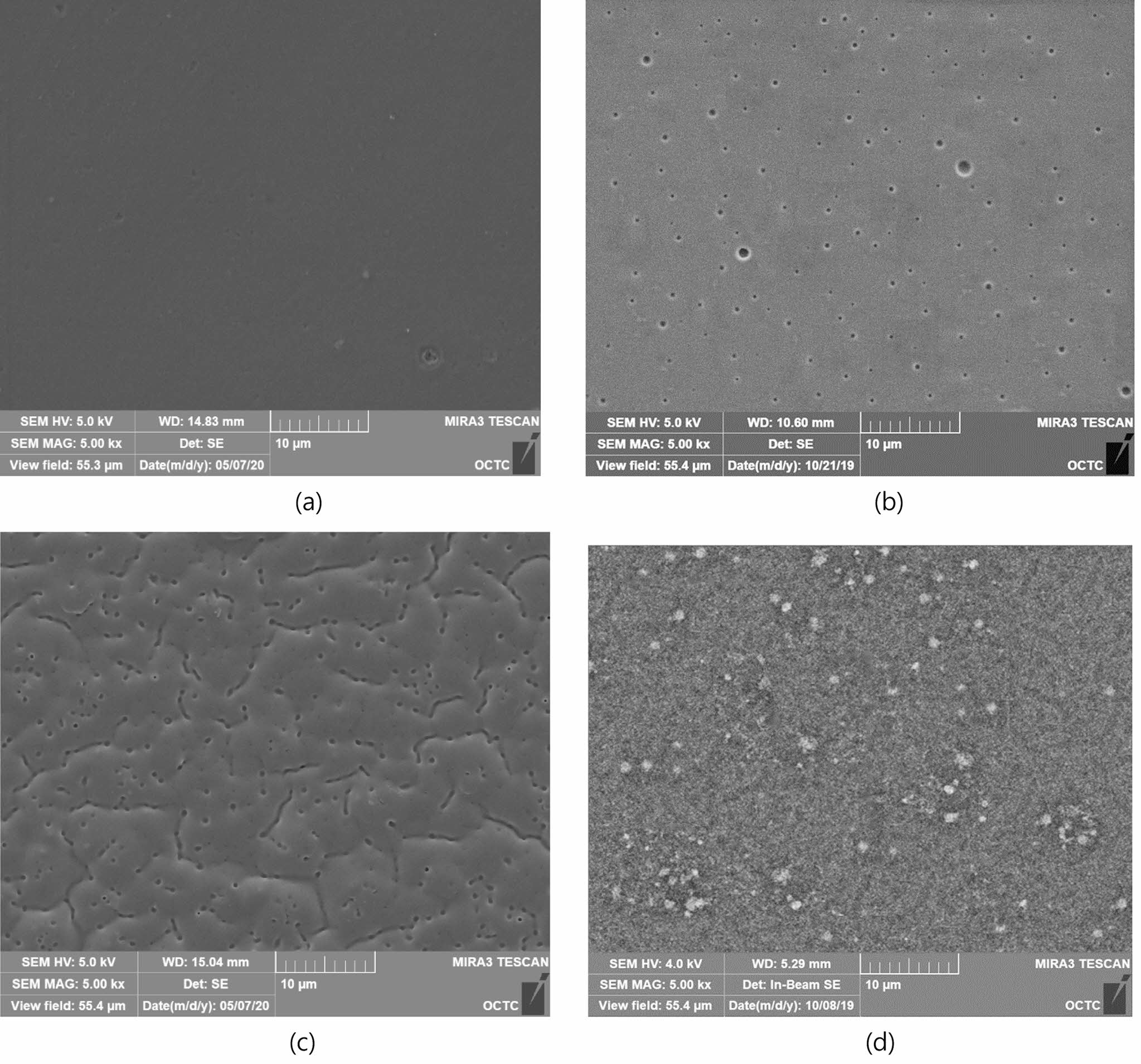 Scanning electron microscope(SEM) of silicon hydrogel contact lens: (a) nonporous contact lens without alginate and metal ion(R); (b) porous contact lens without alginate and metal ion(S); (c) porous contact lens with alginate(SA); (d) porous contact lens with alginate and calcium ion (SAC).