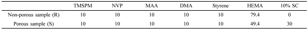 시료제작. 본 연구를 위해 제작한 다공성과 비다공성 실리콘 하이드로젤 콘택트렌즈에 사용된 단량체와 비율은 Table 1에 제시하였다.